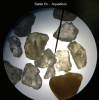 Au microscope, x100, éclairage par en-dessous et au-dessus (pour voir les micas, opaques et brillants, souvent en lamelles de formes plus ou moins géométriques. Brillant transparent = quartz. Blanc translucide : feldspaths probables (?)