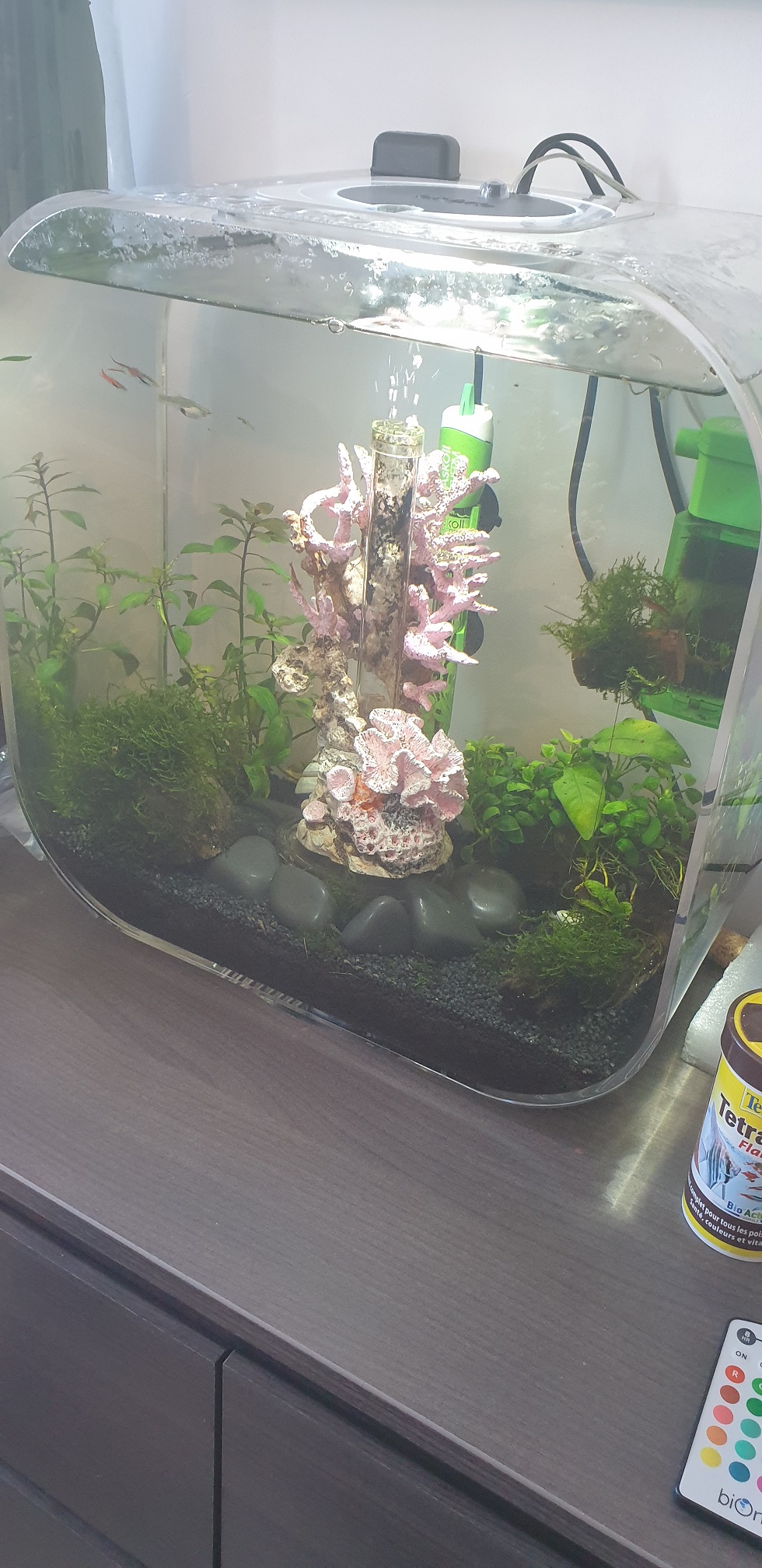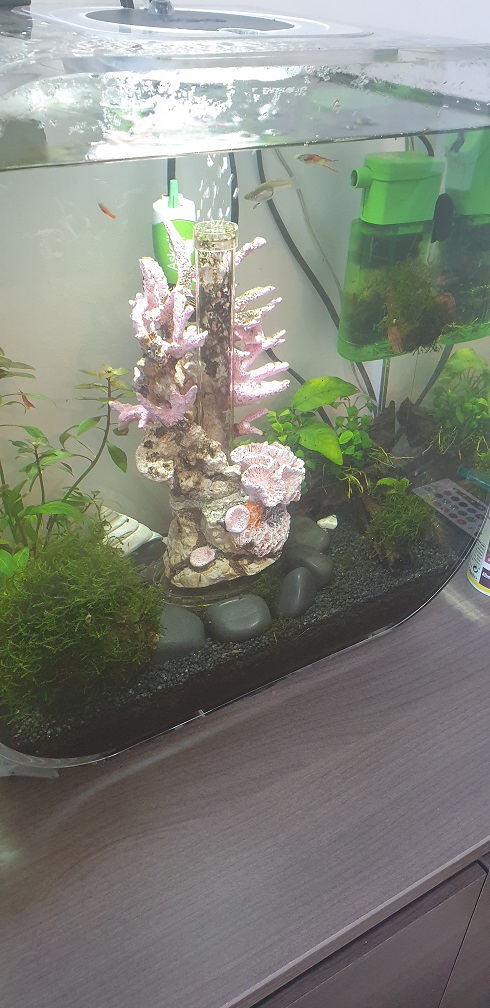 Chose promise, chose due. Voici une présentation de mes aquariums, avec en tout premier mon biob life 30L. Je l'ai entièrement refait avant le confinement avec un sol technique (mais je savais pas, je voulais juste un truc qui aille avec les crevettes) recouvert de gravier noir, une filtration interne 200L/h, rempli à l'eau de conduite.
