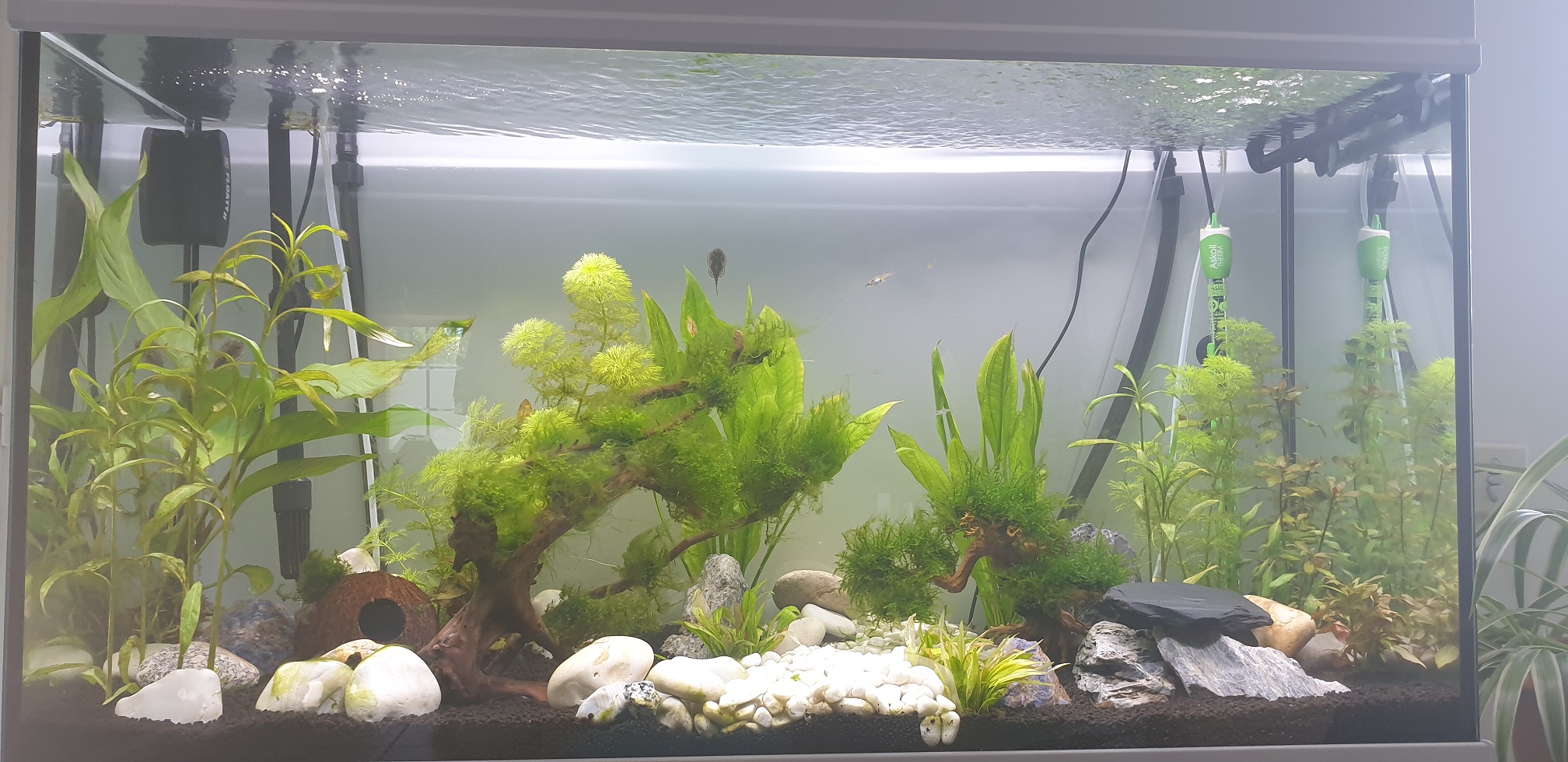 J'ai deux bulleurs au cas où il ferait très chaud pour que le taux d'oxygène reste bon pour les sewellia, mais pour le moment je ne les utilise pas. Les cannes de rejet du filtre font des remous à la surface, il paraît que c'est suffisant (et comme je n'ai aucun poisson qui reste à piper en surface, j'en déduis que c'est bon).