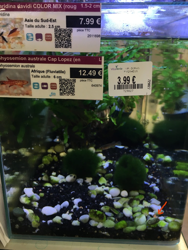 Décidément, les crecre ont du mouron à se faire en animalerie. De passage dans une jardinerie en province, je viens de découvrir que maintenant ils ont des animaux, dont un petit rayon aquario. Les vendeur/euses n'ayant pas changé, il y a comme un problème. Les bacs sont propres, rien à redire, mais : - des Betta dans des box taille verre à dents, transparents donc se voyant mutuellement (je croyais que c'était fini) - un malheureux Farlowella dans un 70-80l à tout casser avec des guppies, des néons, corys... et d'autres . J'ai eu du mal à ne pas craquer, mais je ne vois pas comment le ramener et encore moins où le coller (le 180l des rubras, tout seul? Ce ne serait pas terrible). Vu le prix, autour de 30€, j'espère qu'il trouvera preneur éclairé. - et le clou du rayon en photo. J'ai tiqué déjà sur le "color mix", et en voyant les poissons taille adulte qui étaient avec, j'ai eu un gros doute. Au début, je n'arrivais pas à voir les crevettes, et puis j'en ai trouvé une. Les 6 pattes en l'air. Pas étonnant, ils ont dû adorer l'apéro !