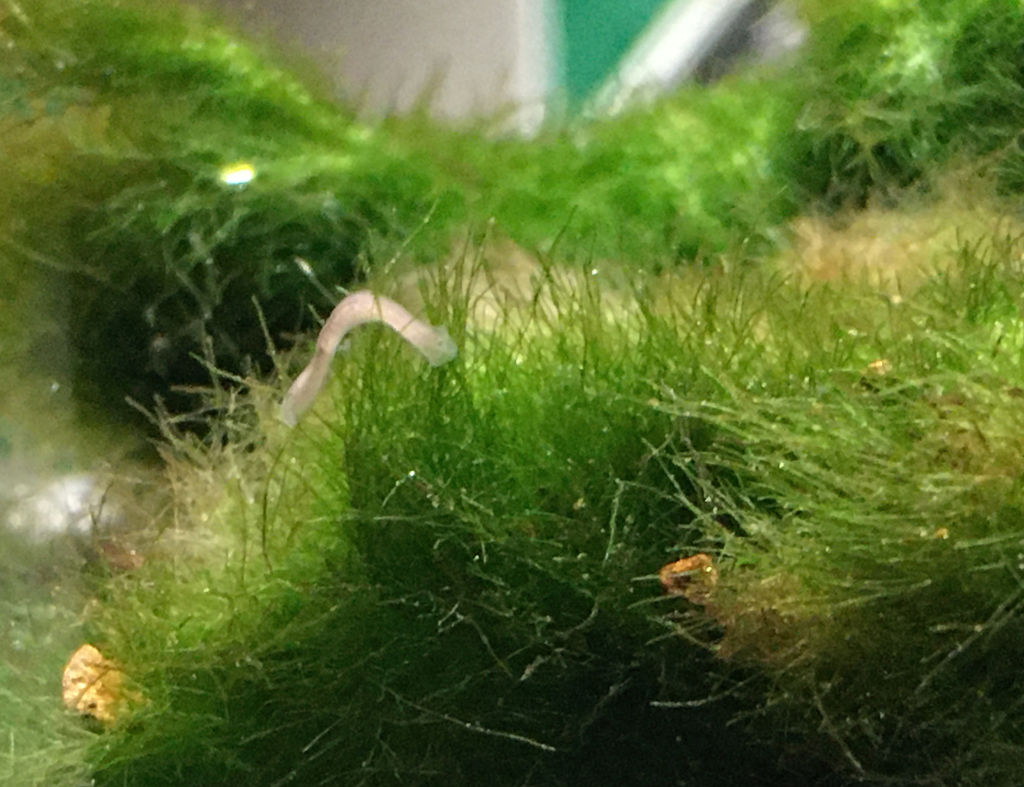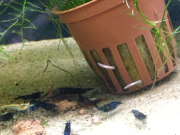 Bonsoir à tous Cherchant de nouvelles red cherry pour relancer ma souche, je suis passée dans deux animaleries. Dans la première, il n'y en avait pas (Truf..), dans la seconde, il y en avait mais...déclassées, parfois des souches en mélange, et surtout, voici ce que j'ai vu dans TOUS les bacs à crevettes. Là, aucun doute. J'ai appelé le vendeur du rayon pour lui signaler (il venait de conseiller des néons avec platys dans 50l à une cliente qui pourtant voulait tout bien préparer avant de prendre des poissons). Sa réponse "ah, j'avais pas vu, et c'est grave? Je ne connais pas". Vu la taille des bestioles, déjà aussi grandes que les crevettes adultes, avec plein de juvéniles en maraude, je lui ai fait savoir que ses clients futurs risquaient de râler s'il leur en vendait des contaminées. Il a fait la grimace et m'a remerciée très fraîchement. Bon. Je sais déjà où je n'achèterai pas de crevettes. Déjà que c'est là que j'ai eu Luak le faux plakat aux nageoires rongées et deux gastromyzones dans une eau à 27°C. La photo est floue (grmlbl téléphone qui faisait la mise au point sur le pot de plantes), dommage pour la BdD!