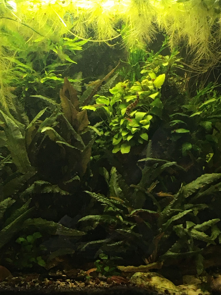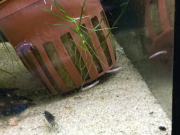 Édit : je viens de retrouver une femelle morte  certes, l’eau est moyennement dure, mais les blue velvet sont avec les killies dans une eau encore plus douce et se portent comme des charmes. Les mêmes dans le 30l low tech ne se reproduisent pas. Les red cherry chez Tango se reproduisent aussi dans de la Volvic. Dans tous les bacs, les escargots ont des coquilles très moches. Si c’est un manque de minéraux ça devrait affecter tous les bacs. En plus je leur donne des boulettes spécialement pour ça, seuls les escargots les mangent, elles les ignorent. Si elles étaient en manque elles les mangeraient non? De mémoire elles étaient sur un sol à grain noirs en animalerie. Le même que le bac des cristal à côté . Le passage d’un sol technique à une eau plus dure les aurait perturbées ?