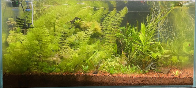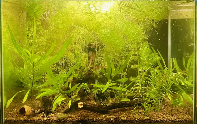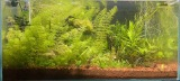 La Baignoire envahie par les crevettes.(vitres pas nettoyées, plantes en jungle depuis l'été et éclairage bof car photo prise juste avant l’extinction de la dernière lampe) Je n'ai pas encore introduit les Pseudomugils.