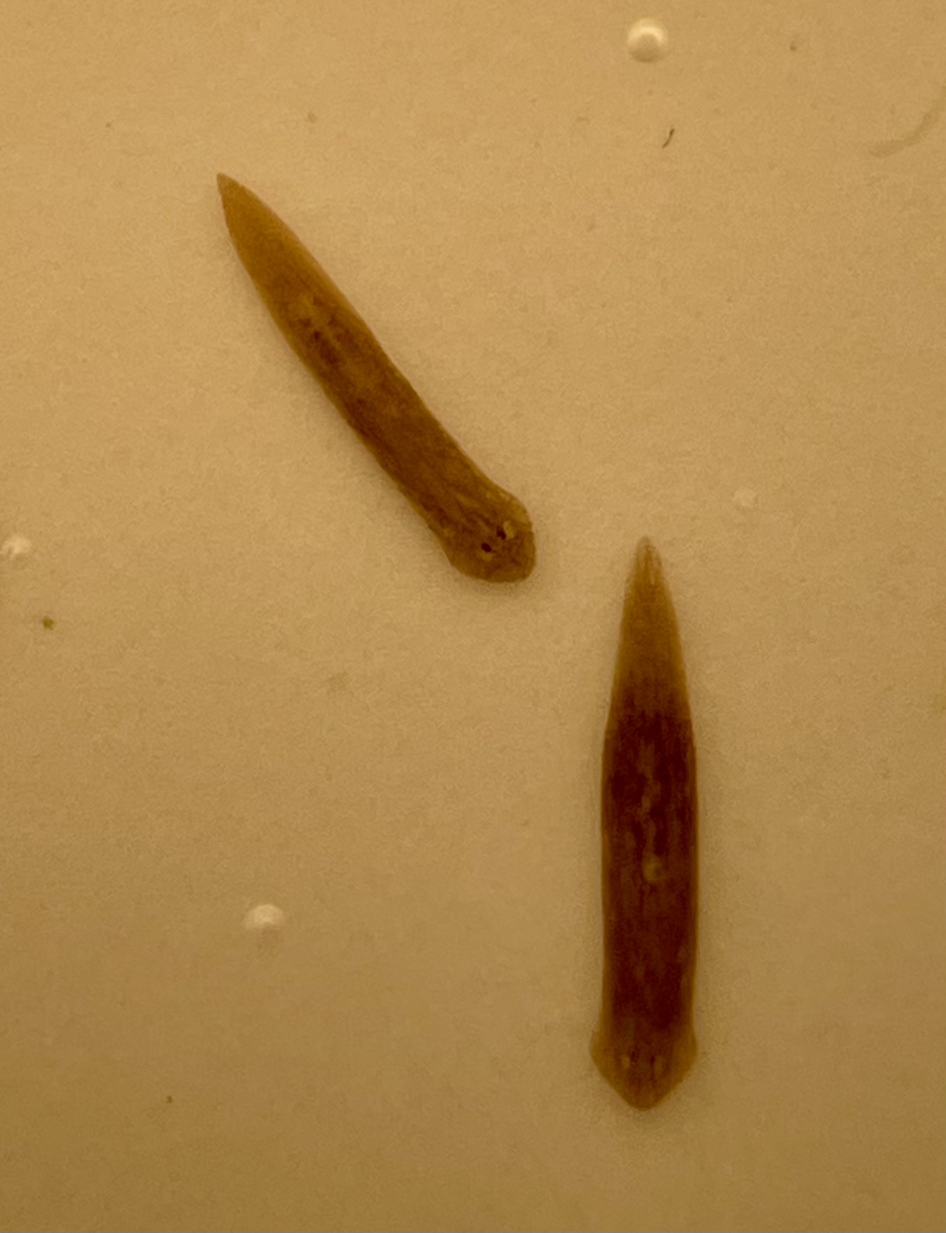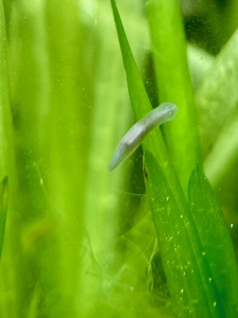 La moins bonne nouvelle, c'est que ça m'a permis de confirmer que j'ai bien des planaires dans la Baignoire...  Elles sont petites, 5 mm de long. Ça n'a pas l'air d'impacter trop les crevettes vu que la population explose. Par contre, j'avais remarqué que j'avais moins d'escargots, en particulier moins de planorbes...  Pour l'instant, à part attraper celles que je vois sur les vitres (sans les couper !), je pense ne rien faire de particulier. Je verrai si leur population augmente...