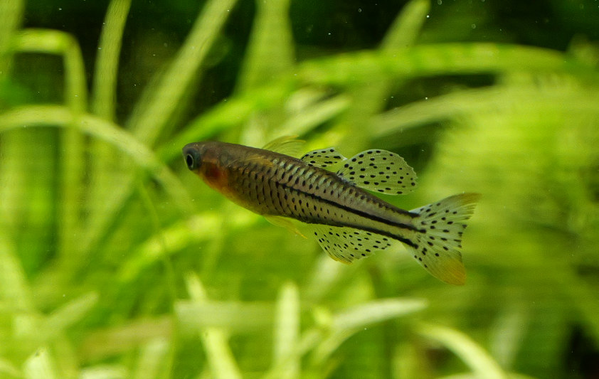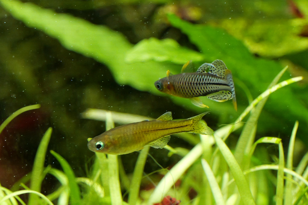 - Au "repos" - c'est à dire zig zag permanents totalement imprévisibles mais nageoires repliées. Bôgosse et le nouveau. Ce dernier n'a pas encore la pointe, mais les taches multiples sur la 2ème dorsale et le orange sur le lobe de la caudale font bien penser à un Aru encore jeune.