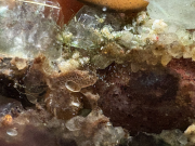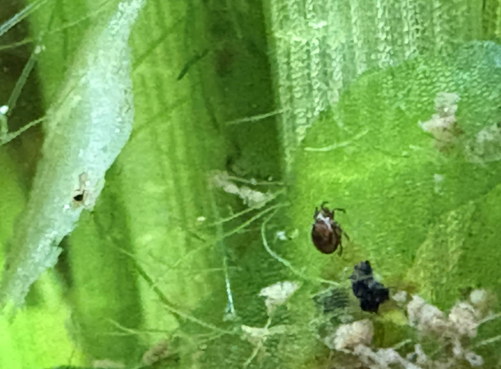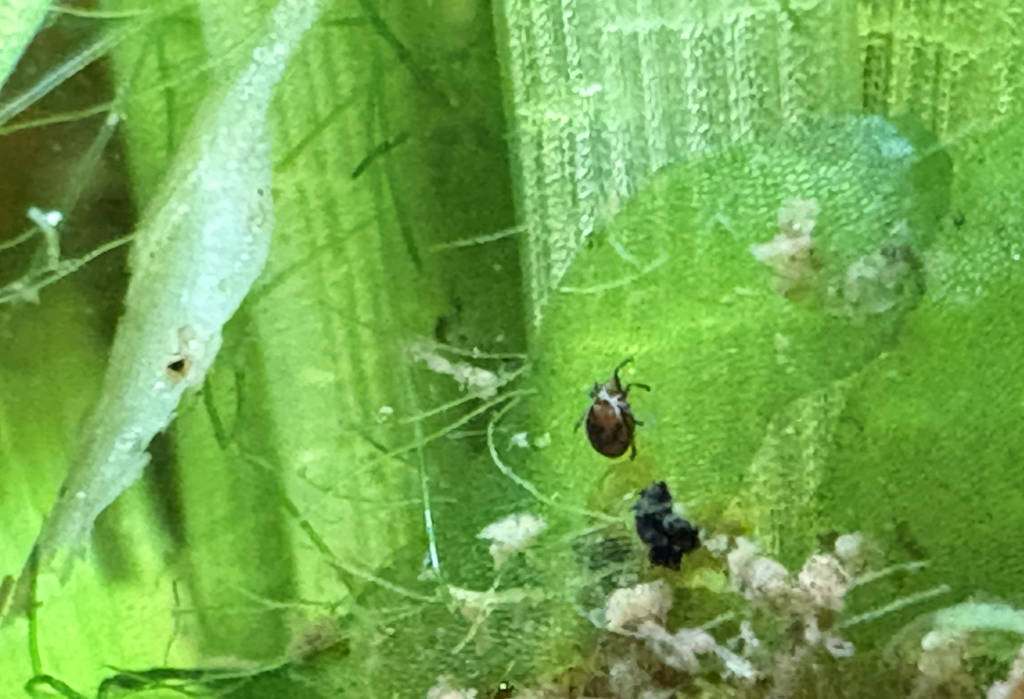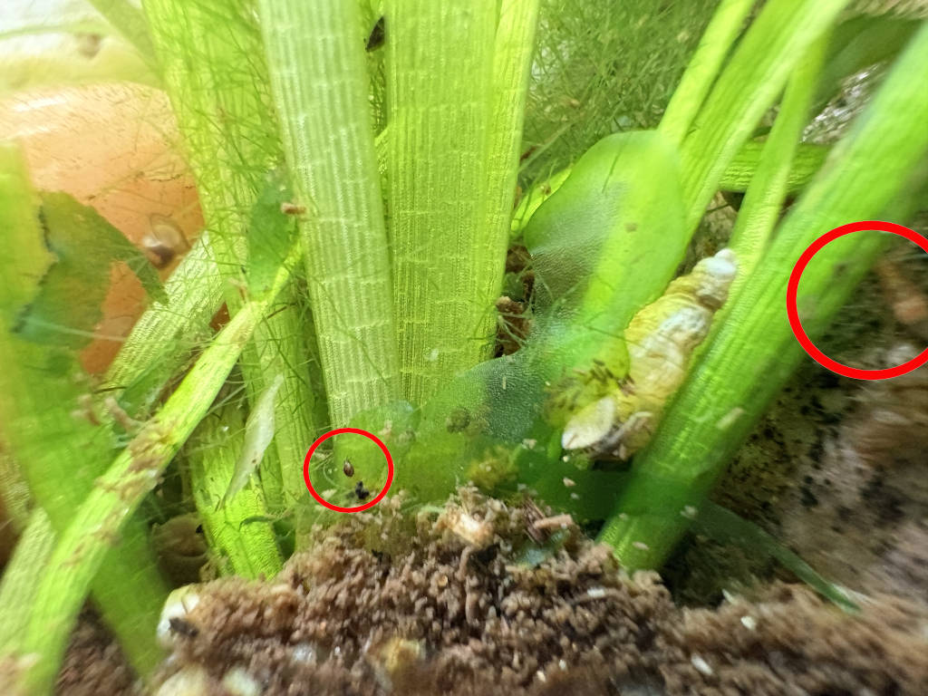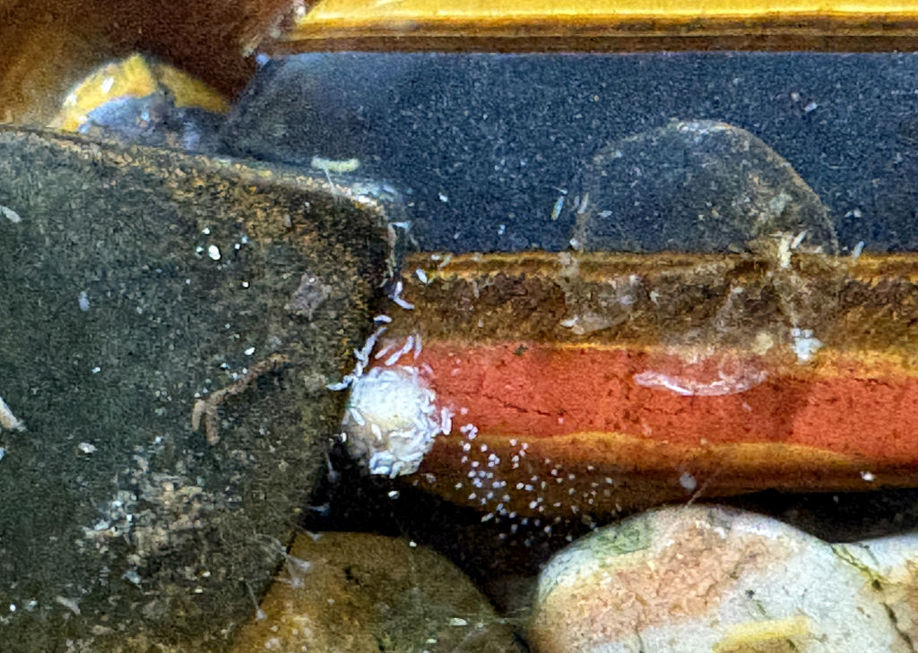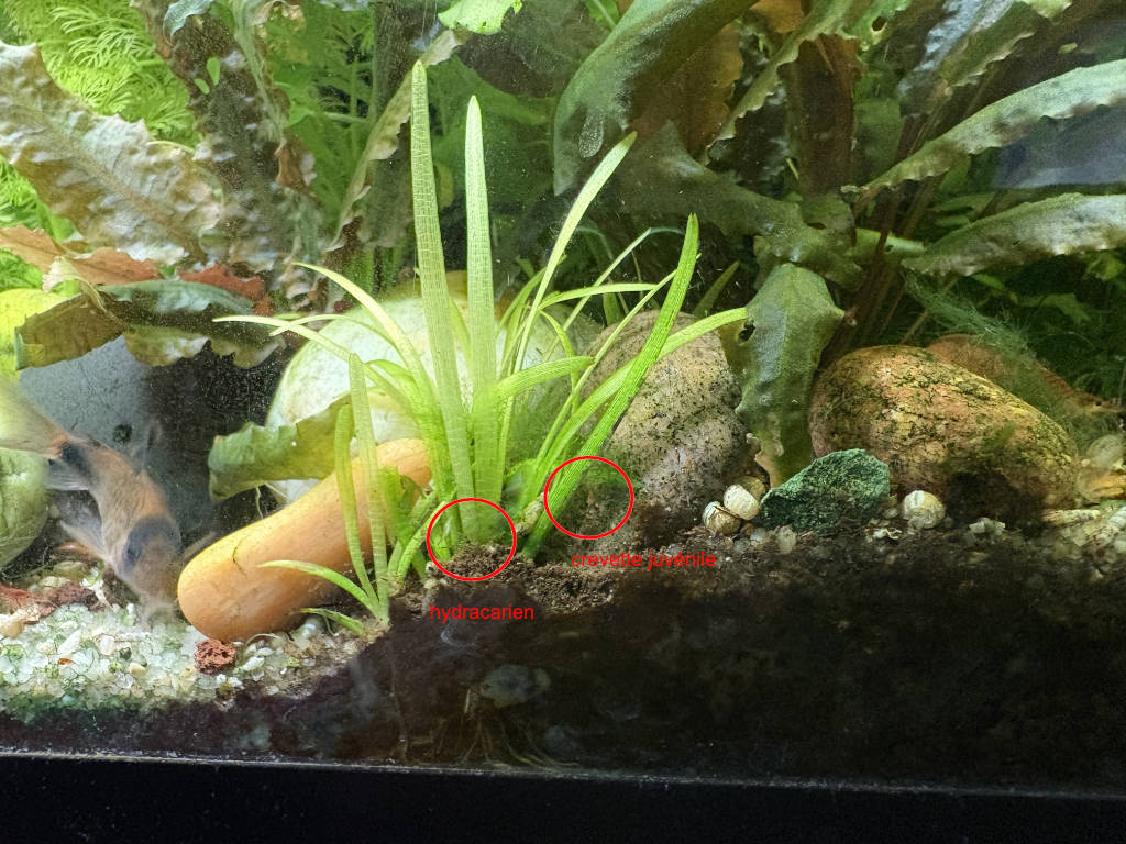 - Bestioles : En cherchant des oeufs, j'ai vu que l'Australo-arverne a des tas de bestioles bizarres, malgré le filtre assez conséquent. J'ai des blackworms, que je vois peu, mais aussi des cyclops qui sont passés en éclair devant le zoom du téléphone. D'autres petites bestioles non identifiées (ressemblent en taille et aspect à Macrostomum, mais ont l'air bien rapides et surtout il me semble distinguer une tête et un corps articulé... dur à dire vu la taille). Ils gigotent beaucoup autour d'oeufs non fécondés. A côté, on dirait bien de toutes petites hydres blanches, peut être des Vorticelles en fait, vu la taille, mais je ne les ai pas vues se rétracter et le pédoncule a l'air trop gros. Il arrive que les raquettes tressautent brusquement. Ca pourrait en être la cause (?)