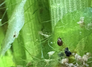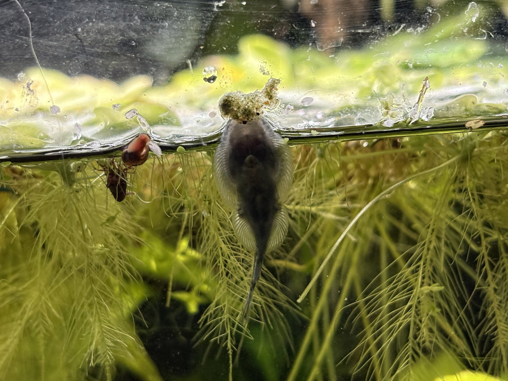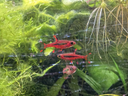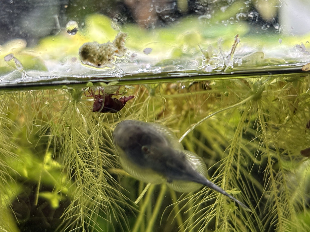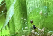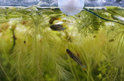 - Les Boraras brigittae ont de superbes couleurs, il m'a semblé en voir un tout rouge faire des petits soubresauts autour d'un autre un peu plus pâle, immobile dans les racines de pistias (et SVP pas de remarque désobligeante sur les vitres rayées de la vénérable Boule à Neige !