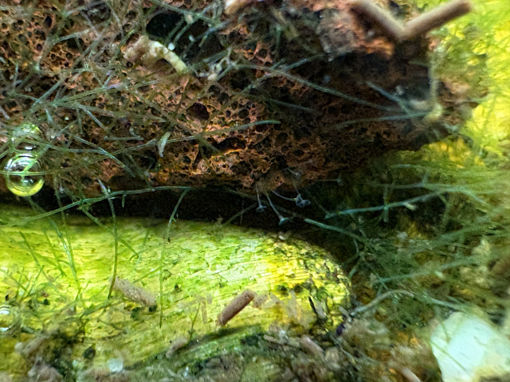 J'ai une fois de plus enlevé un gros morceau de la mousse Amblystegium serpens qui mérite bien son nom. Elle sort de l'eau sur le bois de la racine araignée, et pendouille un peu partout, de préférence entremélée aux Rotalas H'ra, ce qui n'aide pas à prélever. Le morceau est allé dans le 360l où une fois de plus il va mystérieusement disparaitre de la racine (hein les corys et chenilles? Qui c'est-t-y qui va fouiller dedans?)