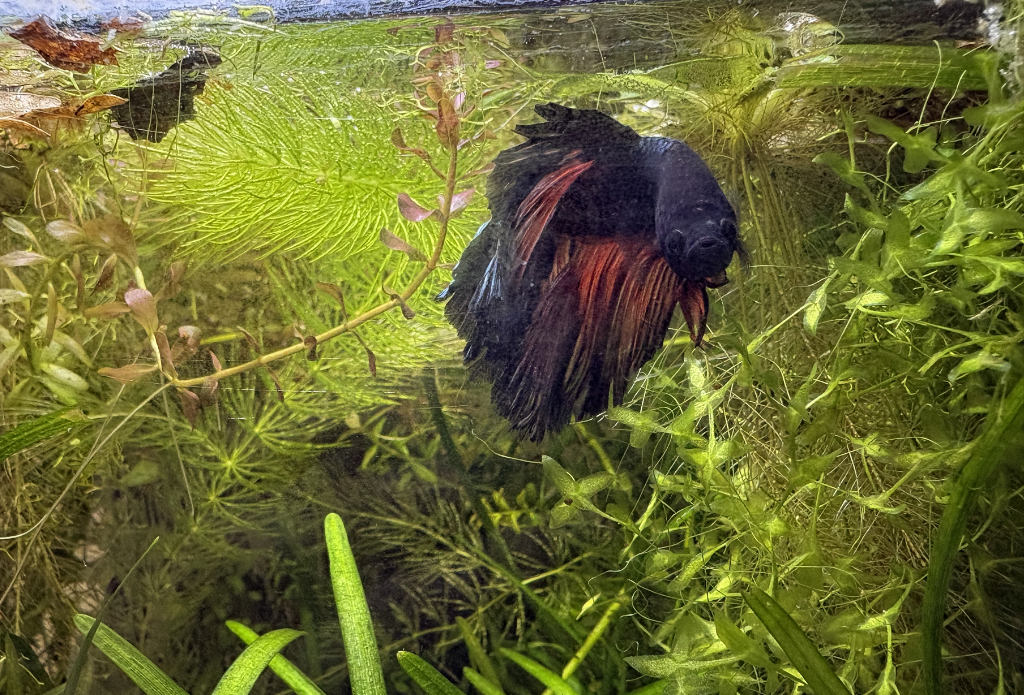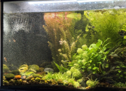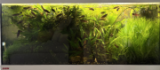 Enfin le Swamp, chez les rubras. J'ai eu la flemme de sortir l'APN pour faire des photos de la mort qui tue des (nombreux) Bettas, mais juste une photo du bac, après un gros élagage, comme toutes les semaines, et re-plantage des Blyxas que ces sal**piots me déterrent pour se cacher dessous, tous les jours. Le gros truc vert au milieu qui sort de l'eau pour s'écraser sur la led c'est une Ceratopteris Vache qui rit. J'enlève aussi régulièrement plein de plantules sur les feuilles qui font des plantules sur les feuilles qui font.... (*soupirs*) Et devant, des bucephalandras qui s'étalent partout.