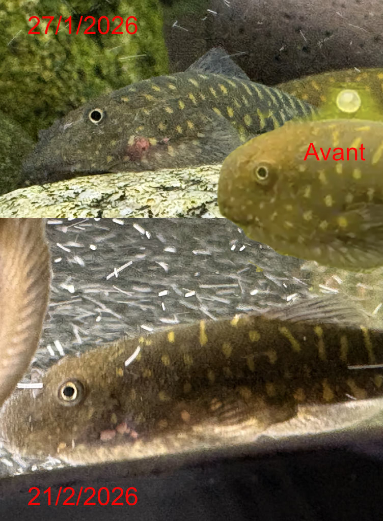 - les malades : restent apathiques (sauf Papattes, survoltée), mais se montrent et bougent, mangent même peu. Les blessures ont disparu chez les Gastromyzons, chez Papatte la repousse est timide d'un côté, rien de l'autre mais pas d'aggravation non plus.