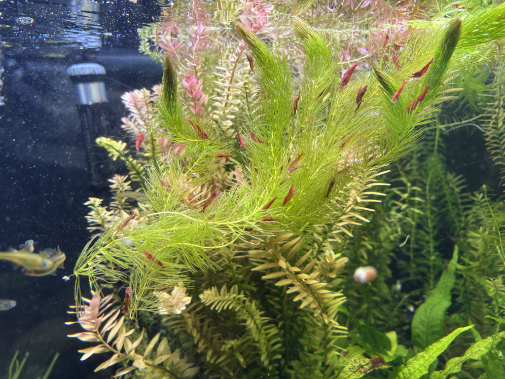 Deux arbres à crevettes. Le premier en début de semaine sur un lollie au paprika, le second sur des cerato reçues ce matin de chez Aquazolla, mises à flotter en attente de plantation (et ce soir, c'est daphnies !).