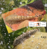 Je n'ai pas fait de photo pour cette dernière lors de sa maladie, elle avait la queue avec arêtes apparentes sur au moins 1/3 de long, l'une pendouillait, et des lambeaux de peau (j'ai fait un dessin). Ca a complètement disparu ! Pour elle, je l'avais capturée et badigeonneé de eSha 2000 dilué, dans un couvercle de boite de Pétri, tandis que pour n°6 j'avais badigeonné directement dans l'aquarium (deux fois, après ayant compris il se carapatait). Actuellement, on ne voit qu'une zone roseâtre près de l'opercule, mais uniquement sur photo parce qu'à l'oeil nu, tout est coloré comme avant, avec juste un petit creux en avant de l'opercule qui témoigne de la petite nécrose locale. Le eSha en badigeon a fonctionné on dirait, à voir sur le long terme, mais c'est bon à savoir.