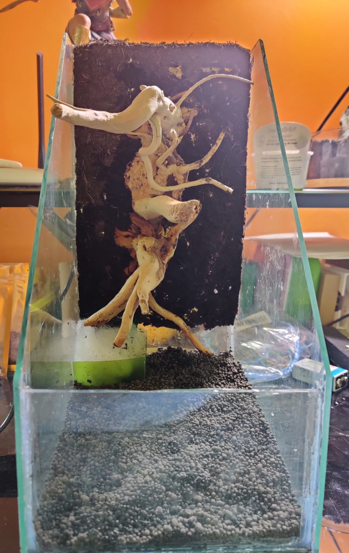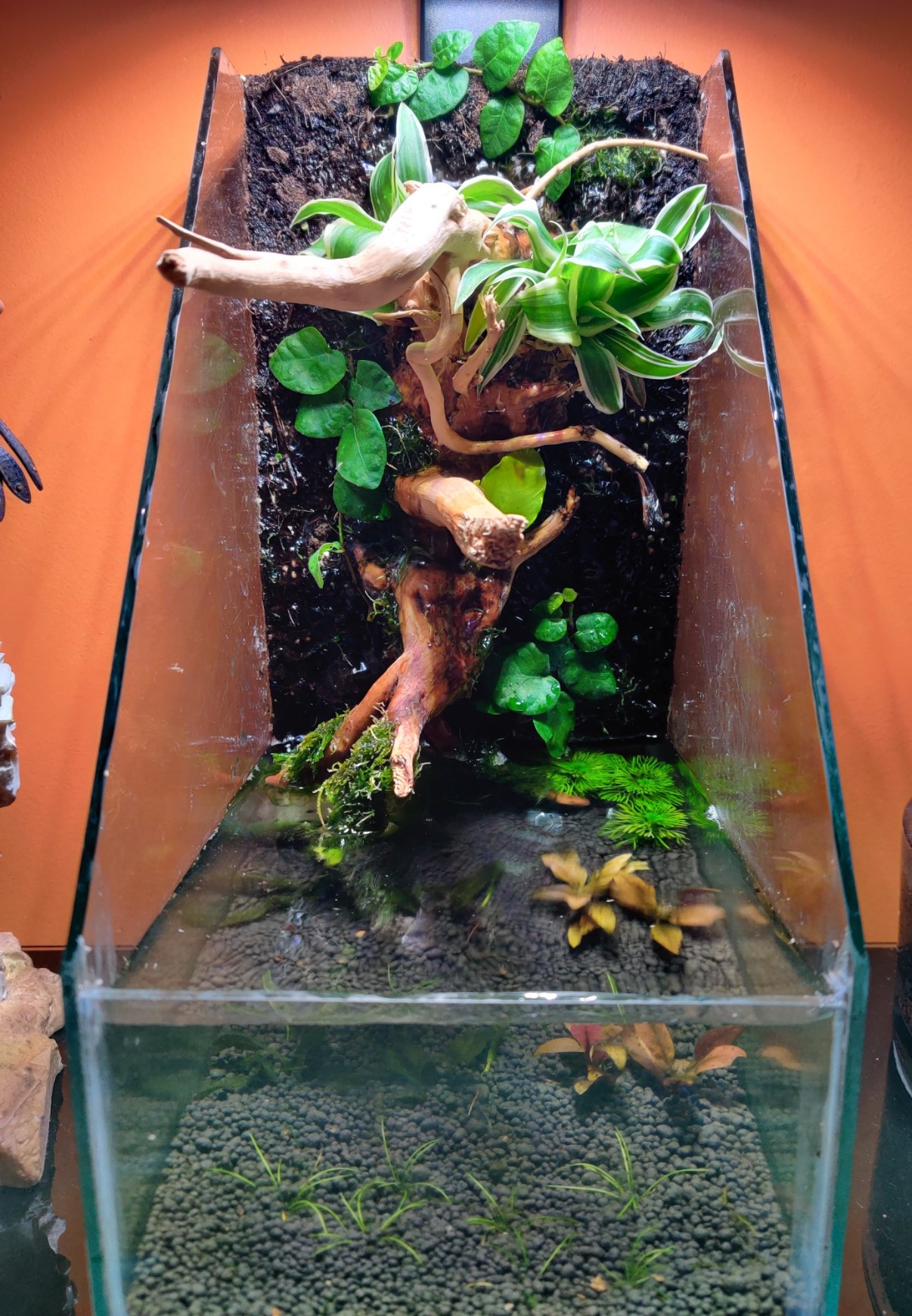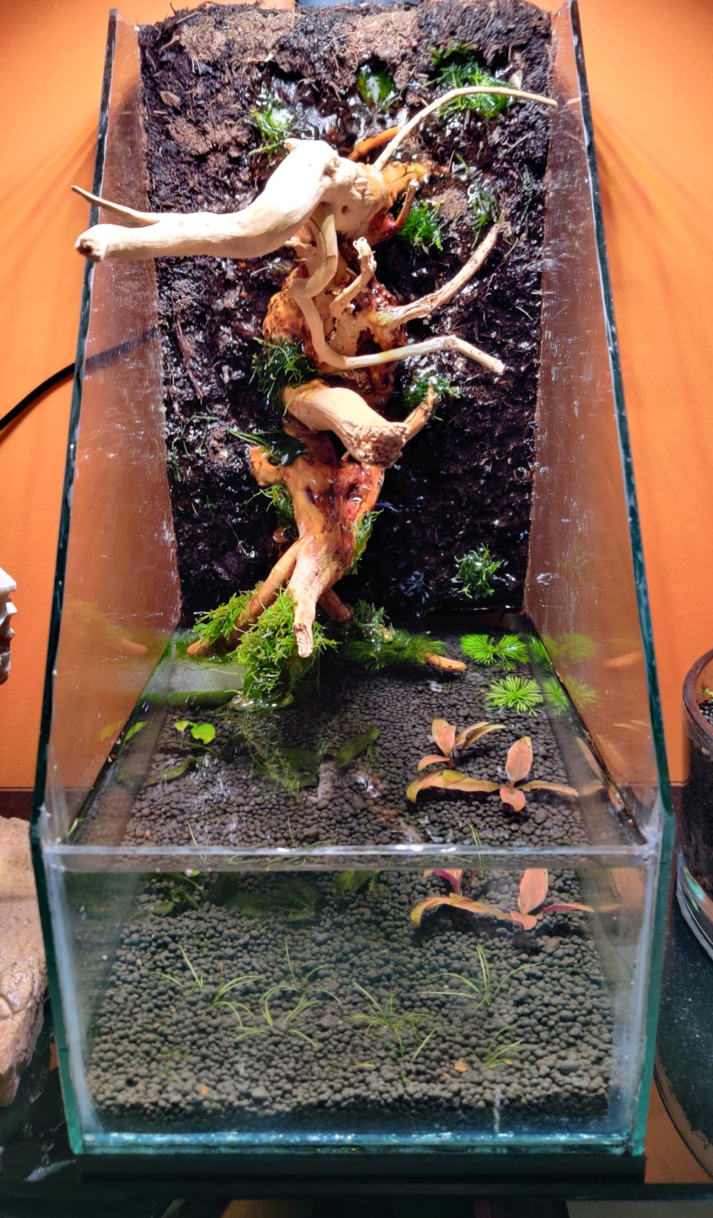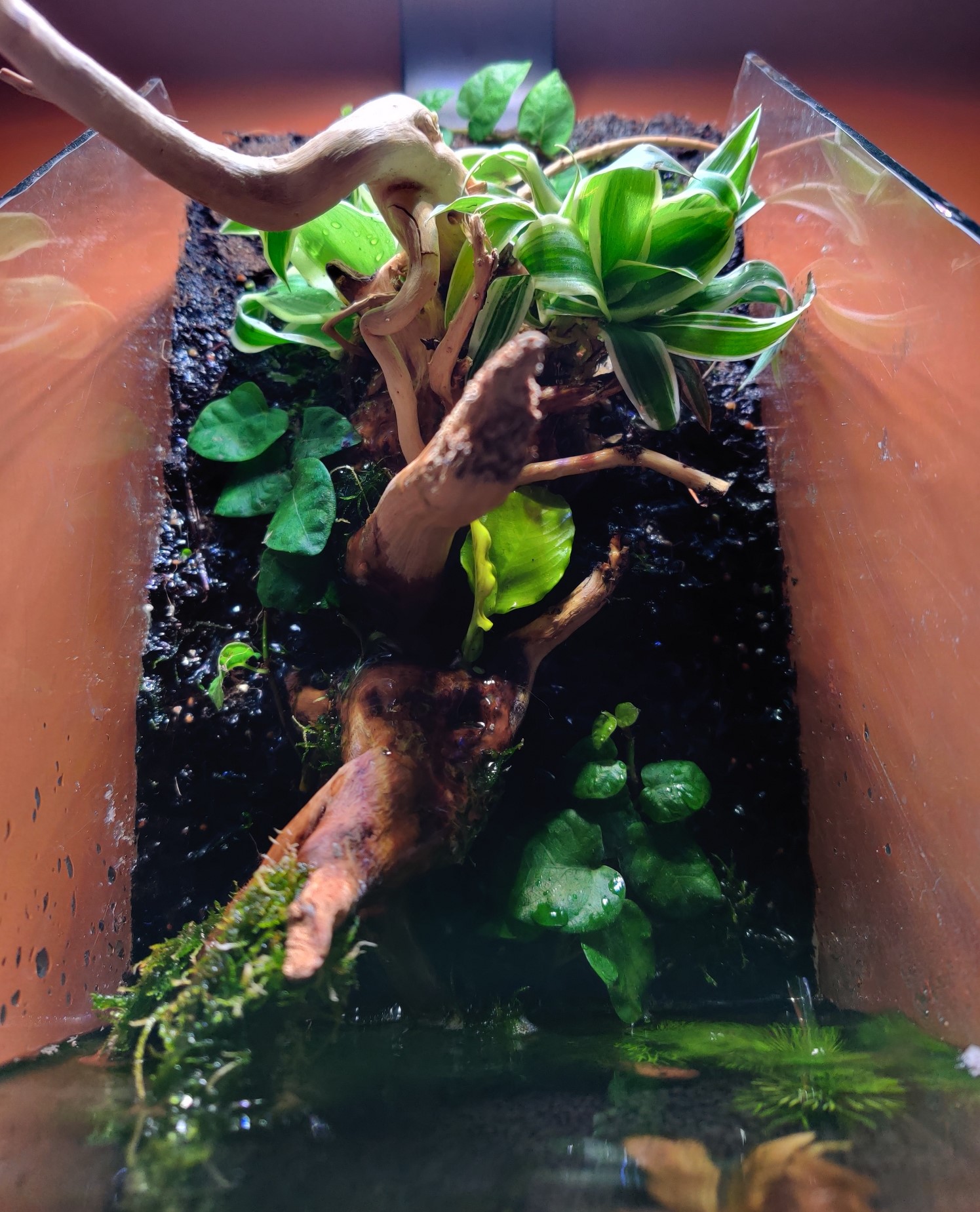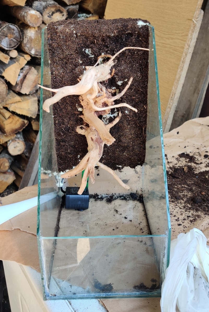 - j'ai ensuite placé le hardscape qui est fait avec des mini racines asia acheté sur skaii&shrimps et de la mousse expansive, j'en ai profité pour ajouter la petite pompe que j'ai acheté environ 5€ sur AliExpress (reçu en 1 mois mais vu le prix ça vaut le coup), elle fonctionne en USB donc consomme rien :) . Quand tout avait fini de sécher j'en ai profité pour tester la petite cascade que j'ai fait avec une sorte de rampe designé et imprimé en 3d par mes soins qui créé trois flux d'eau, un au milieu principal et deux plus petits a droite et gauche.