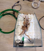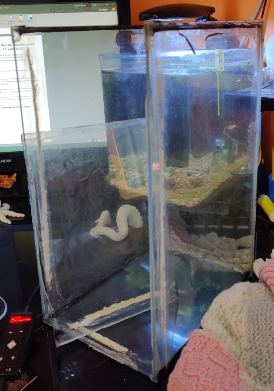 - enfin 2 mois après, j'ai reçu le silicone d'aquarium et ai donc pu coller la petite vitre que j'avais enlever et recouper à la bonne dimension. J'ai aussi pu coller une sorte de terre tropical pour plantes d'intérieur (j'avais que ça).