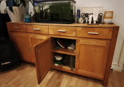 Le meuble a l'air de qualité et devrait supporter un bac de cent litres sur l'un des segments ou même placé au centre. Quatre-vingt litres ne devrait pas poser de problème. Maintenant, le meuble à l'air récent et le fabricant doit avoir des informations sur sa résistance. Comme il a l'air récent, il peut aussi être en bois reconstitué et être fragile. On doit aussi pouvoir mettre des renforts invisibles à l'intérieur du meuble... Mais je ne suis pas menuisier. Tu n'as pas une connaissance qui peut regarder ça de prés ?
