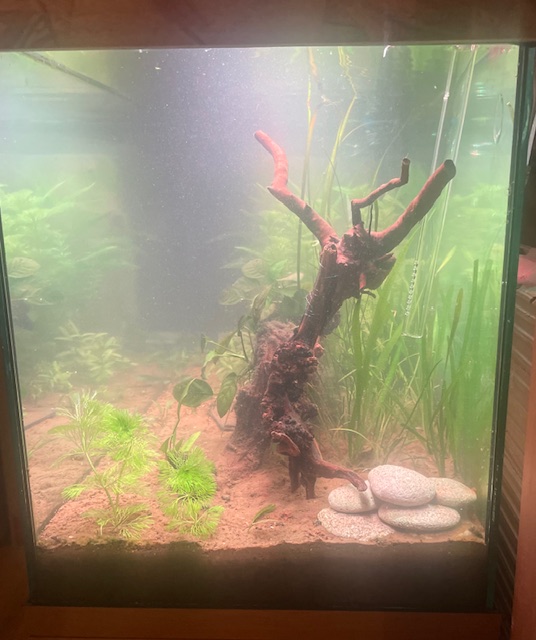 J'ai aussi ajouté des galets qui étaient dans mon jardin. (l'eau est trouble parce que je viens d'installer les racines) Le côté droit s'étoffe.