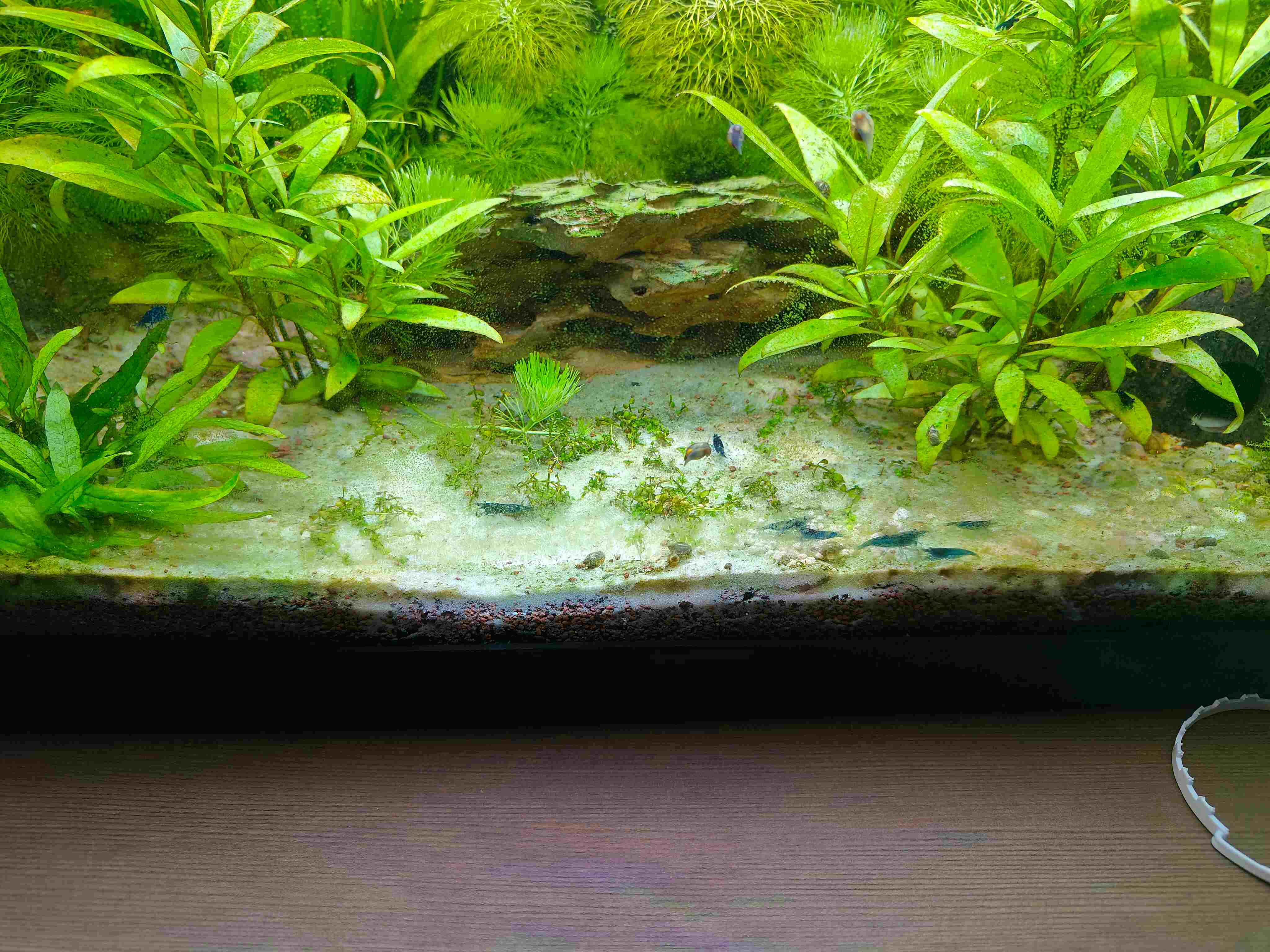 Un peu de cyanobactéries semble t-il, comme c'est souvent le cas dans les jeunes bacs. Pour les hydres, il n'y a que très peu de danger pour les crevettes, mais les daphnies et autres bestioles lentes peuvent être capturées.