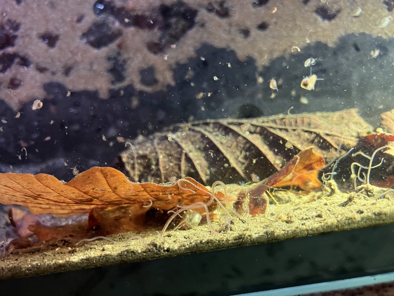 Je commence à avoir beaucoup de daphnies dans la partie culture  Et elles se collent au filet, comme si la bonne nourriture arrivait de l'autre partie du bac (Ce qui semble logique)