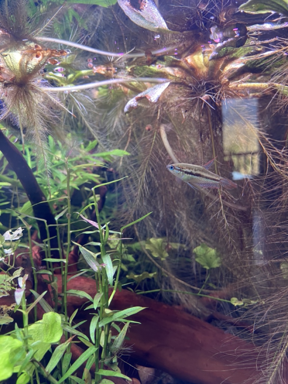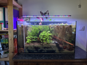 En tout cas je me suis dis que c'était temps d'introduire des prédateurs pour réguler tout ça. Et que par la même occasion, ils produiront une source de CO2 par leur respiration qui ne ferra pas de mal aux plantes ;-) Du coup j'ai trouvé un male et 2 femmes Smaragdina guitare. C'est pas simple à obtenir! Des mois de recherches. Mais BettaLand a été au top. J'ai introduit aussi 5 Pumila, qui sont arrivés bien maigre, et qui contrairement aux Bettas, semblent encore très stressé du voyage...  J'avais une micro faune importante dans le bac partie poisson, et bien les 3/4 n'ont pas passé la première journée  Mention spéciale aux cyclops qui ne se laissent pas attraper aussi facilement que les daphnies. Il va falloir trouver le bon ratio de transvasement des daphnies de la partie culture à la partie poisson! Les Bettas et les Pumila s'ignorent complètement pour le moment. Je suis vraiment satisfait de ce démarrage, même si rien est gagné, le concept semble prométeur! A++