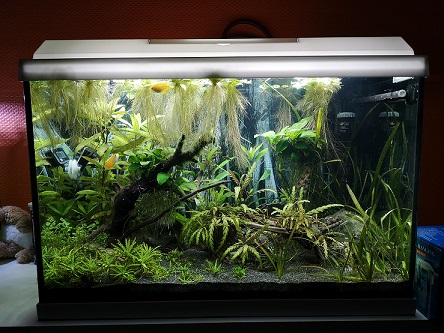 Concernant les habitants, nous sommes aujourd'hui avec un couple de Colisa Chuna, 10 Microrasbora Galaxy, 6 Caridina Japonica et 3 Neritina. Tout ce petit monde se porte bien.