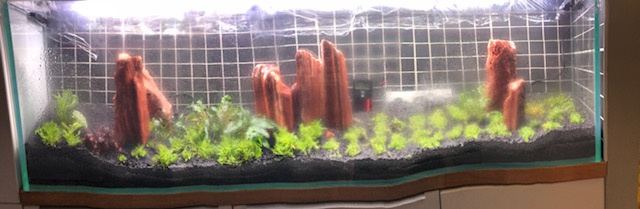 4/ Dry Start Plantation de toutes les plantes compatibles avec la méthode : - Marsilea Hirsuta (Trèfle d'eau hirsute) (++) - Ammania sp. Bonsai (+) - Pogostemon Helferi (+) - Cryptocoryne petchii (+) - Cryptocoryne Willisii (+) - Micranthemum sp. Monte Carlo (++) - Echinodorus Aquartica (++) - Alternanthera reineckii "Mini" (+++) J’ai rempli avec de l’eau de conduite jusqu’à imbiber le manado. Recouvert le bac d’un film alimentaire pour garder l’humidité (85%) et la chaleur => Pendant 1 mois j’ai aspergé les plantes 2-3 fois par jour Les plantes ont toutes plutôt bien accepté le dry start, certaines ont bien poussées (+++) et d’autres un peu moins, voir ont un peu souffert sur la fin (+). Une fois que j’étais sûr que la Monte Carolo était bien enracinée, j’ai mis le bac en eau. Je n’ai pas constaté de dégradation des plantes suite à la mise en eau, pas particulièrement de perte de feuilles. 5/ Mise en eau 100% eau de conduite car je me disais que je risquais d’avoir une forte montée de GH à cause du Manado dans les 1ers jours et qu’un gros changement d’eau serait inévitable. Je ne voulais pas sacrifier 60L d’eau osmosée pour rien. Finalement la montée de GH n’a pas eu lieu (je suppose que les 2 semaines en eau ont aidé), le GH est resté à 11 pendant une semaine comme mon eau de conduite. Ensuite j’ai procédé à de multiple changements d’eau pour descendre jusqu’à un GH de 4. J’ai également profité d’une promo sur la Volvic pour en acheter quelques dizaines de litres. En revanche mon eau est toujours un peu trouble, l’inconvénient de ne pas avoir de filtre, pas mal d’éléments en suspension et un peu de micro vivant (je ne sais pas ce que c’est). J’ai une pompe de brassage qui remue un peu l’eau, mais pas au point de nettoyer toute la surface, j’ai toujours un voile de surface à l’opposé. Mon Manado a pris une teinte rouge sur une fine épaisseur depuis le dry start. Visiblement le fer contenu dans le Manado, je n’avais jamais lu que cela pouvait se produire. Ce n’est pas très esthétique, mais l’eau ne semble pas particulièrement chargée en fer. J’espère que cela se passera bien. Petit à petit j’ai ajouté des mélanoides et 2 Neritina, et j’ai croisé quelques physes arrivées avec les plantes j’imagine. 6/ plantes supplémentaires - Hemianthus micranthemoides - Hygrophila Siamensis - Rotala wallichiii - Myriophyllum Mattogrossense - Myriophyllum Guyana (je crois)