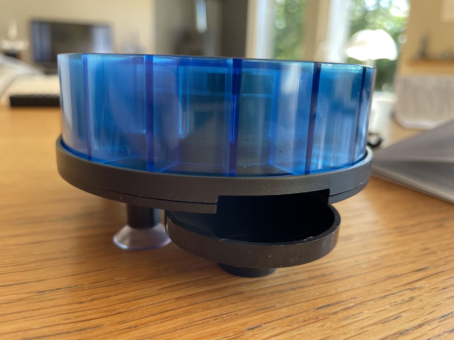 Après une semaine de fonctionnement je suis satisfait du "manège à croquettes" Rondofeeder. La nourriture tombant verticalement et l'ouverture étant de la même taille que le compartiment il n'y a aucun risque de blocage, c'est donc bien adapté aux pastilles. Le remplissage est simple, il y a juste à ouvrir le couvercle et charger, d'ailleurs ça me permet de laisser des casiers vides sans toucher à la programmation, 2 pastilles un jour, une seule le lendemain. Le fait qu'il soit sur secteur avec une batterie est sécurisant en cas d'absence.