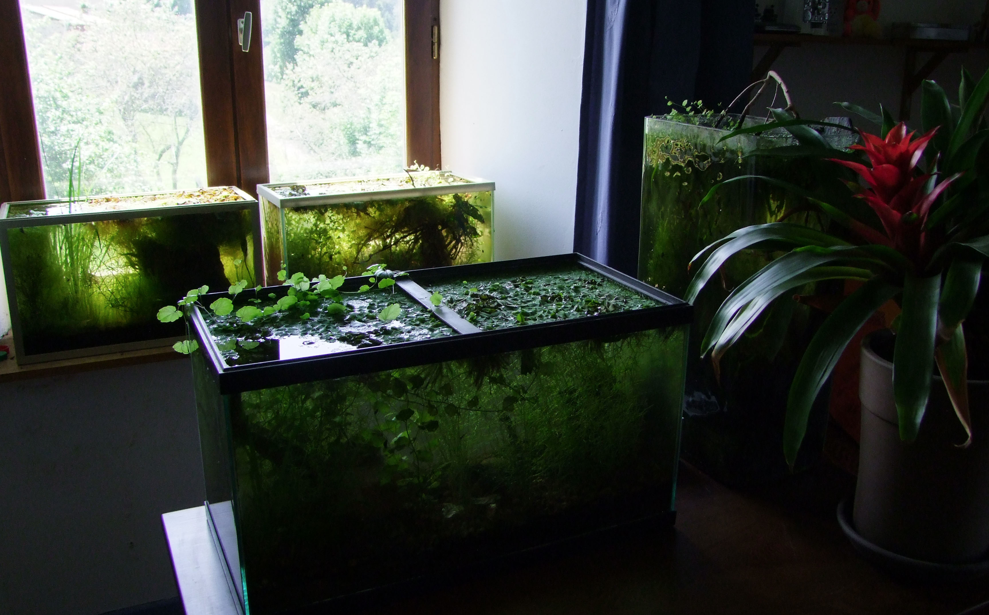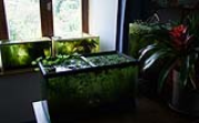 Quatre exemples de bacs libres de technologie. Dans des aquariums "no tech.", la végétation importe peu, pourvu que ça marche. Mais pouvoir recueillir les proies pour lesquelles ils sont installés reste une contrainte. Ici, certains bacs sont "parfaits" et fonctionnent depuis des années sans intervention... mais ils ont fini par être trop végétalisés pour permettre un prélèvement confortable.