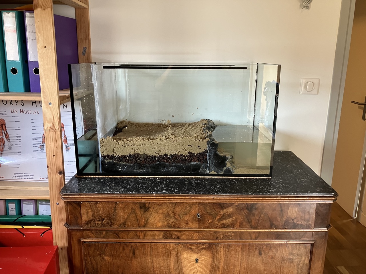 Bonjour, Merci @grand père pour le tips, effectivement il faut des photos en .jpg uniquement pour les charger, il fallait le savoir! Voilà donc quelques photos de l'aménagement du bac. Avant la mise en eau. A gauche la partie pour les daphnies, à droite le décor réalisé en mousse expansive de chez superfish sur un support en plexi. La mousse bleu est pour aider à combler le vide sans avoir à rajouter trop de substrats.  Le filet 60 microns  La pouzzolane pour faire un super refuge à Bactérie  Le sol nutritif:  Le sable par dessus. Malheureusement je n'ai pas anticipé que le sable allait par la suite descendre remplir les espaces vides et que j'allait du coup manquer un peu de hauteur par rapport à ce que j'avais prévus. Pas bien grave mais j'en prévoirais plus la prochaine fois.  Et voilà la bête!  Aujourd'hui la racine est recouverte de presque 1 cm de champignons transparents blanc, c'est toujours aussi flippant^^ Hâte que ça disparaisse! Bon week-end.