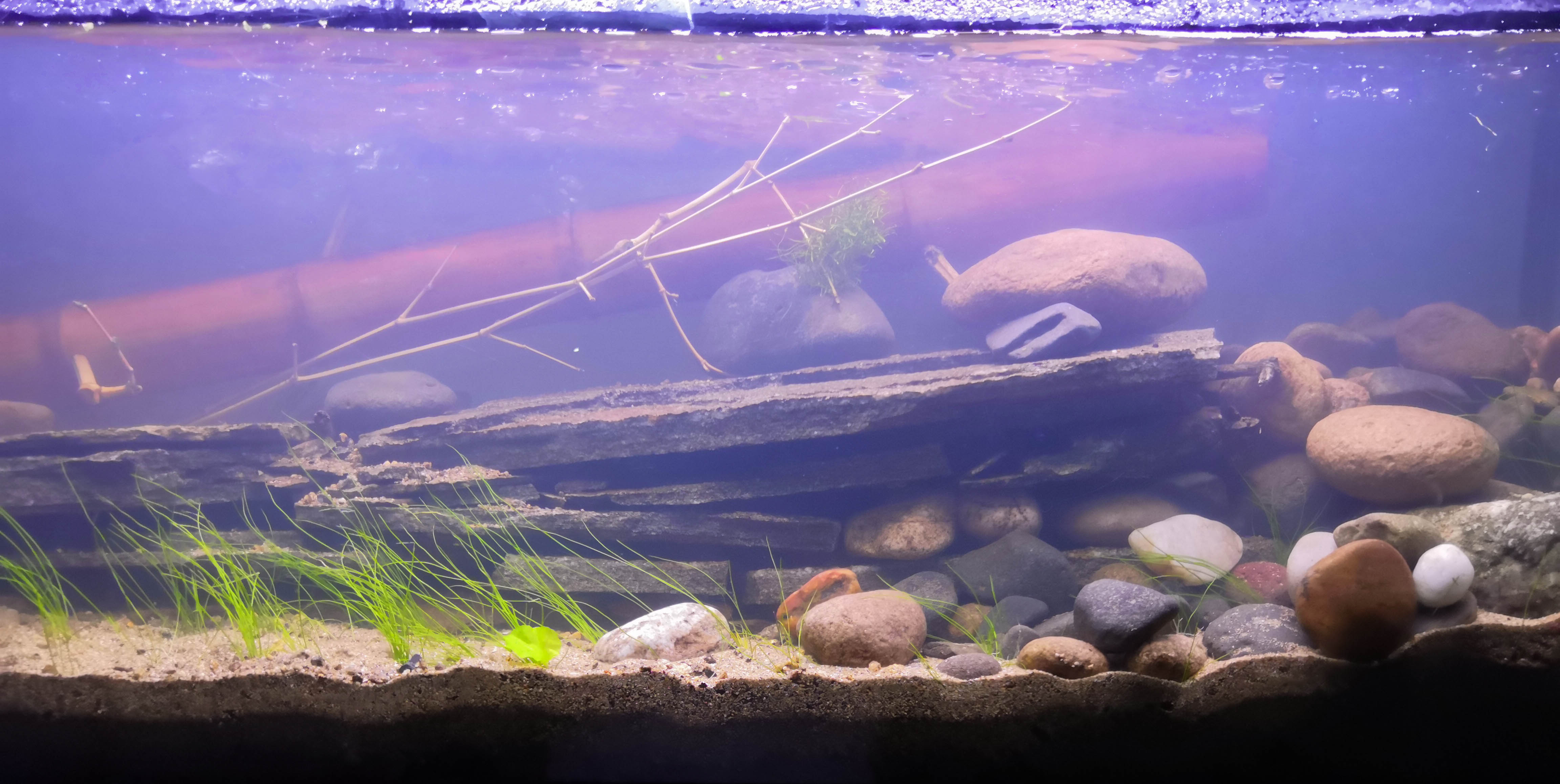 Sinon, pour casser visuellement le mur de galet, un peu de bois flotté, une ou 2 anubias bien attaché, qq touffes de mousse de type fontinalis (a faire prendre a plat, au calme pour qu'elles adhérent bien)