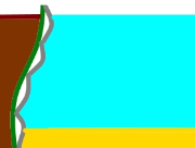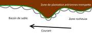 Vu de dessus. En vert, un structure ou sont collés des galets coupés (gain de place). Cette structure est prévu pour laisser passer l'eau à destination des plantes. Au centre, un rétrécissement pour augmenter le courant, à gauche une plage large, donc plus calme avec fond de sable (comme dans la nature). La zone sableuse présente un coin un peu mort, donc peut être propice à une plantes solidement attachée ou enracinée.