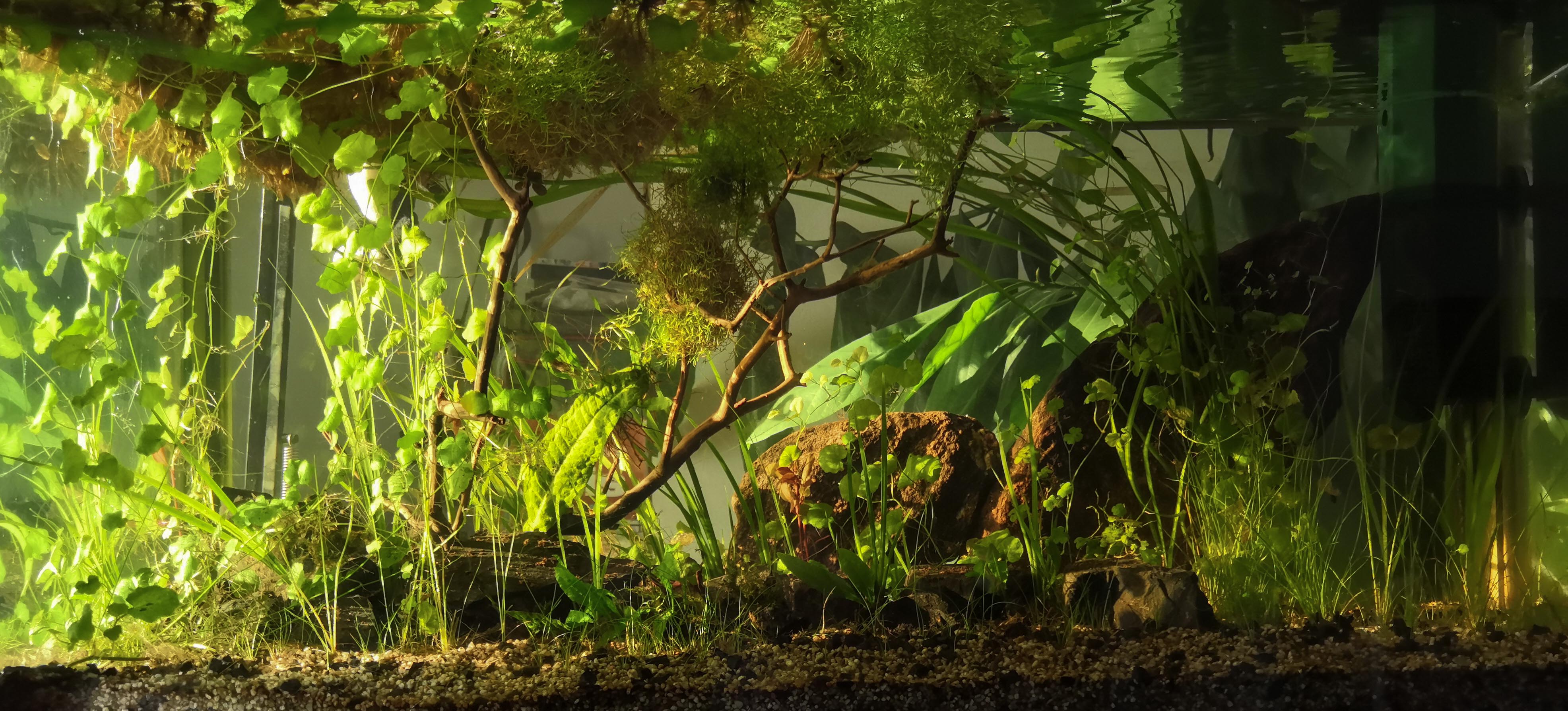 Low tech, possiblement no tech, ce sera un bac de cent litres tout simple. Très planté, peu peuplé, froid en hiver et chaud en été, richement doté en bestioles comestibles, ce sera un bac naturel ,enfin… le plus naturel possible.