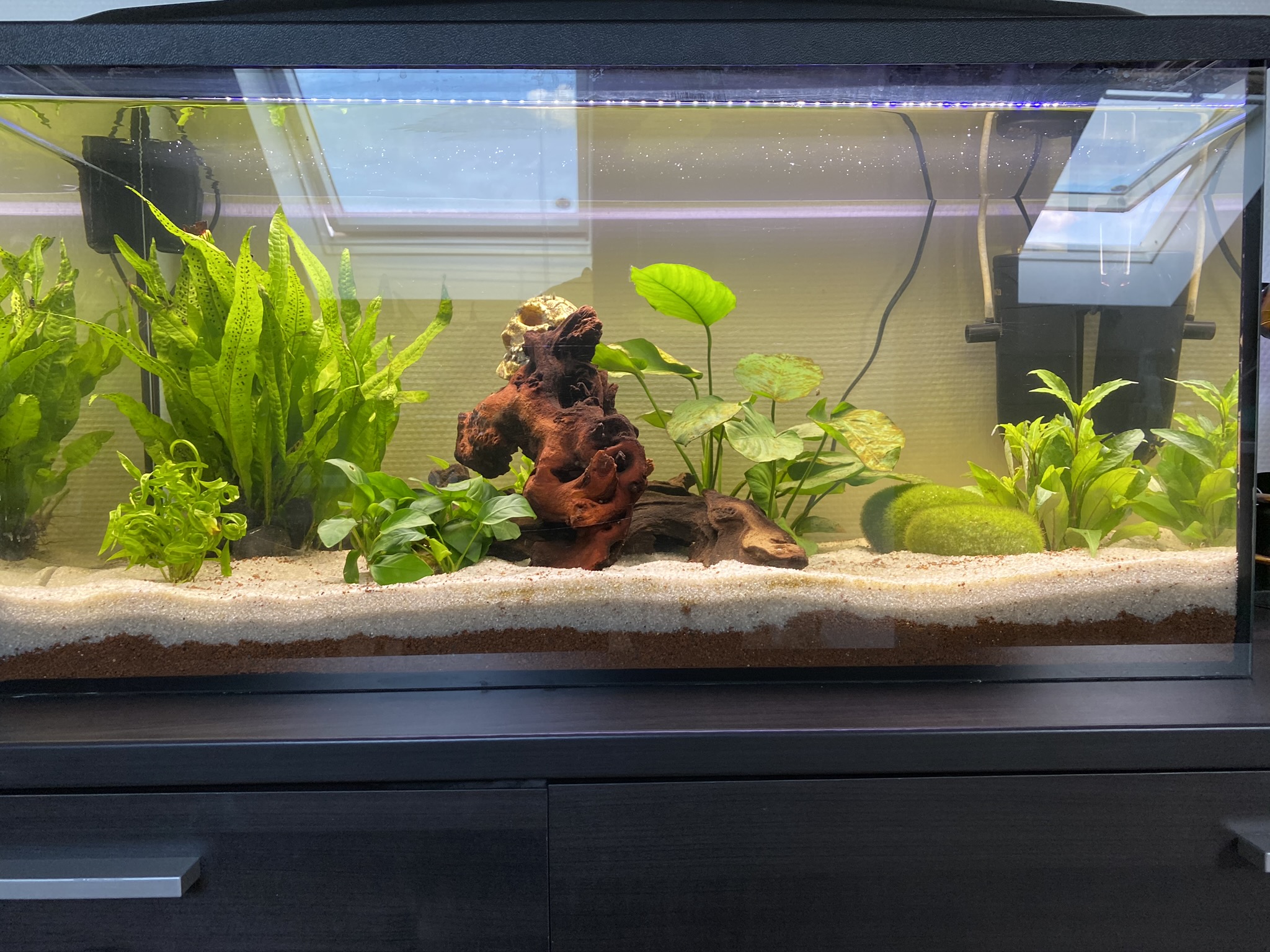 J'ai mis en eau un 100 litres (85x35x35) le 24 juin (avec de l'eau de conduite et du conditionneur d'eau).