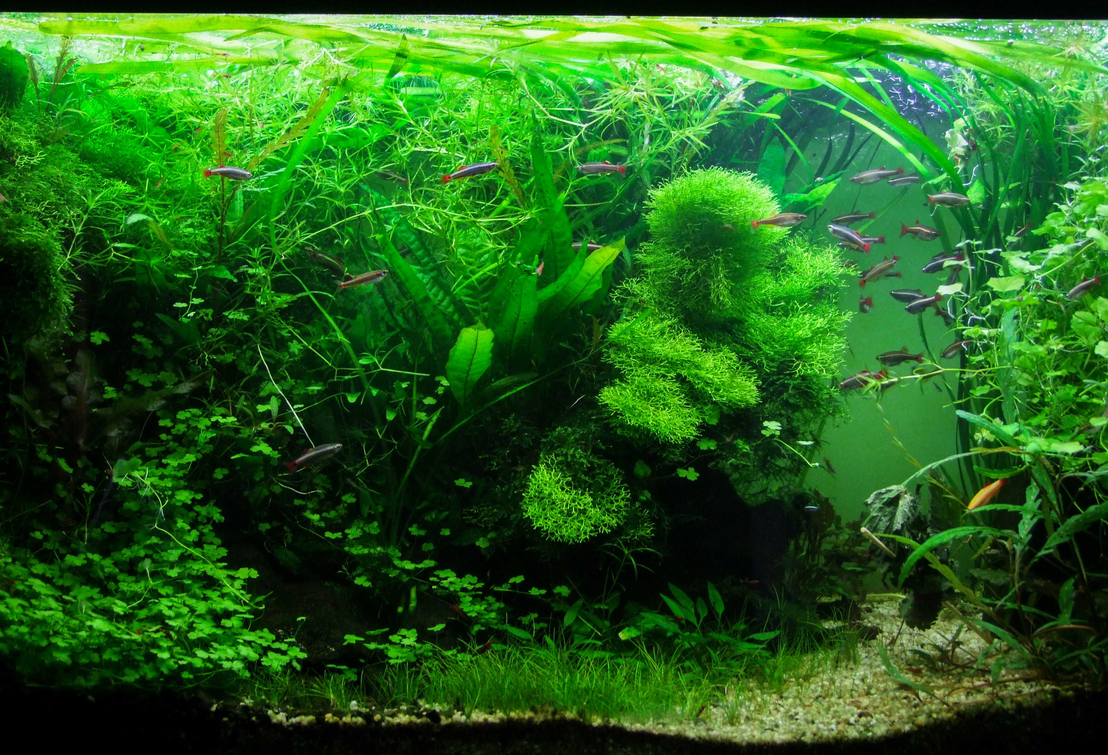 Je n'ai pas de vacances, mais l'été est une période pauvre en entretiens. Un bac planté susceptible de concurrencer les algues a l'inconvénient d'avoir un besoin fréquent d'élagage.  Mais pour être honnête, il y a toutes sortes d'algue dans ce type de bac. Personellement, ça me convient tant qu'elles ne prennent pas la place des plantes.