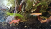 Les poissons ont l'air d'avoir mangé, mais j'ignore si c'est des plus petites crevettes ou des larves et mouches adultes qui se trouvent dans un gobelet directement dans l'aquarium.