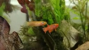 La femelle explore tranquillement l'aquarium, le mâle nage comme un excité le long des parois et ne se calme que quand la femelle le rejoins.