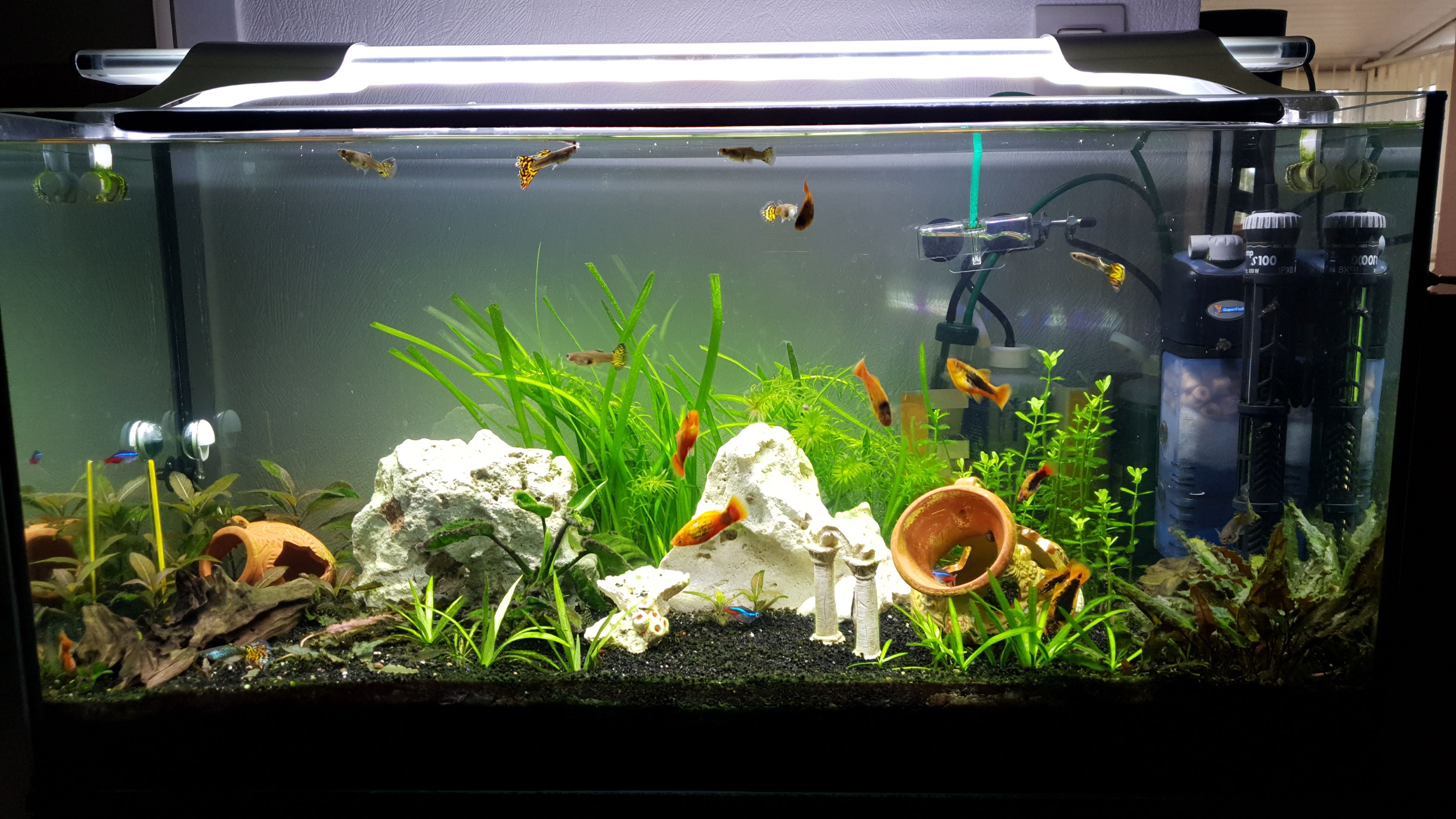 Pour la population, c'est vrai que c'est un peu... du bricolage! Comme tu as une eau assez neutre, ca passe, mais globalement, il y a trop d'espèces différentes pour ce volume et trop de poissons. Je pense qu'il faudra la corriger sur le long terme pour avoir quelque chose de plus viable.