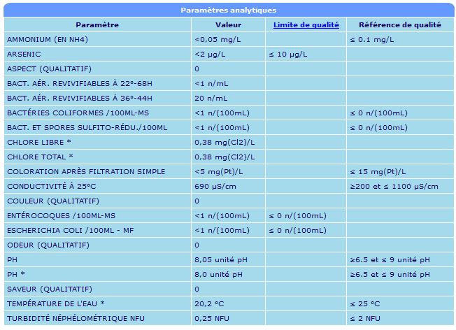 L'aquarium sera rempli avec l'eau du robinet, je ne l'ai pas encore testé faute d'avoir acheté un kit, en revanche j'ai récupéré les données d'analyse que l'on trouve sur internet et je ne sais pas trop quoi en penser puisqu'il y a de 0.05mg/l d'ammonium et un ph de 8.