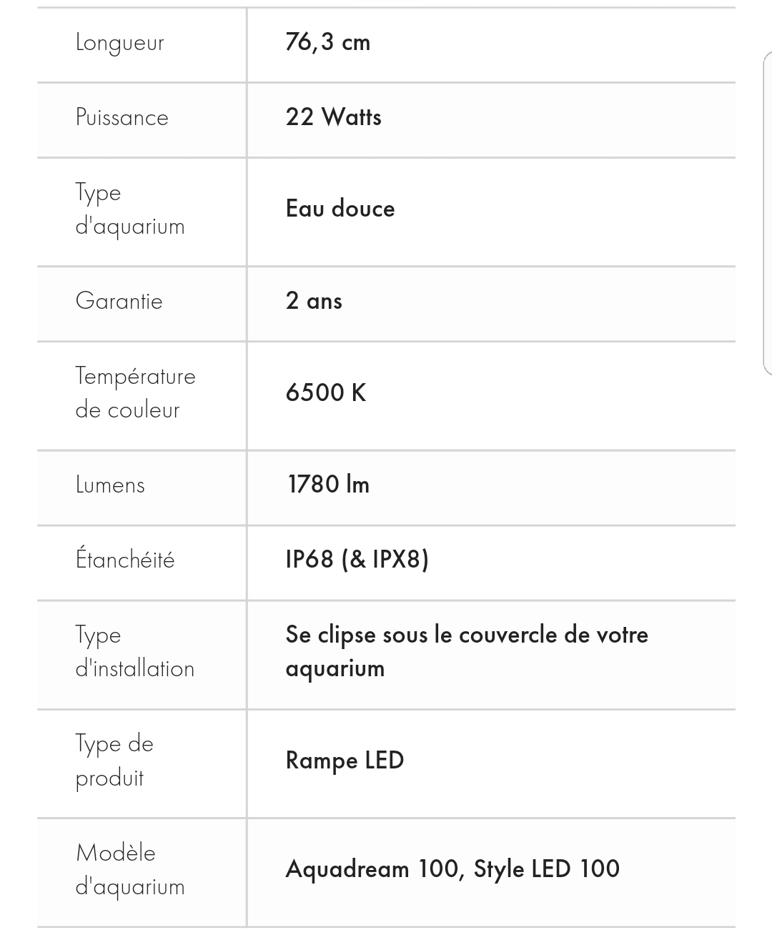 Me revoilà avec une précision de taille. En fouillant un peu partout, j'ai réussi à trouver la puissance de son éclaire. Il serait équipé du système Safe Lighting LED 22w de 76,3cm qui produirai 1780 lm. Si je me suis bien instruit sur l'éclairage, il me faudrait 30 lm par litre. Le bac étant un 115L mais 100L utile, il me faudrait 3000 lm, c'est bien ça ? Et du coup, je suis un peu en sous éclairage ... Raaahhhh quelle galère