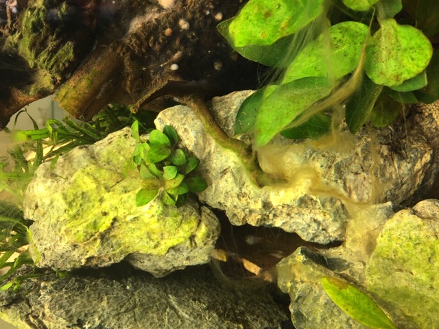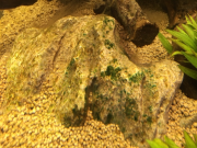 On a aussi de la filamenteuse, sur les 3 première photos. A enlever à la main, mais c'est normal au démarrage. Peut-être un éclairage un peu fort pour un aquarium en cours de démarrage, il manque peut être une ou deux plantes à pousse rapide/flottante. (Si vraiment tu as trop de mal à en venir à bout, en dernier recours, une cure d'easylife algexit peut aider)