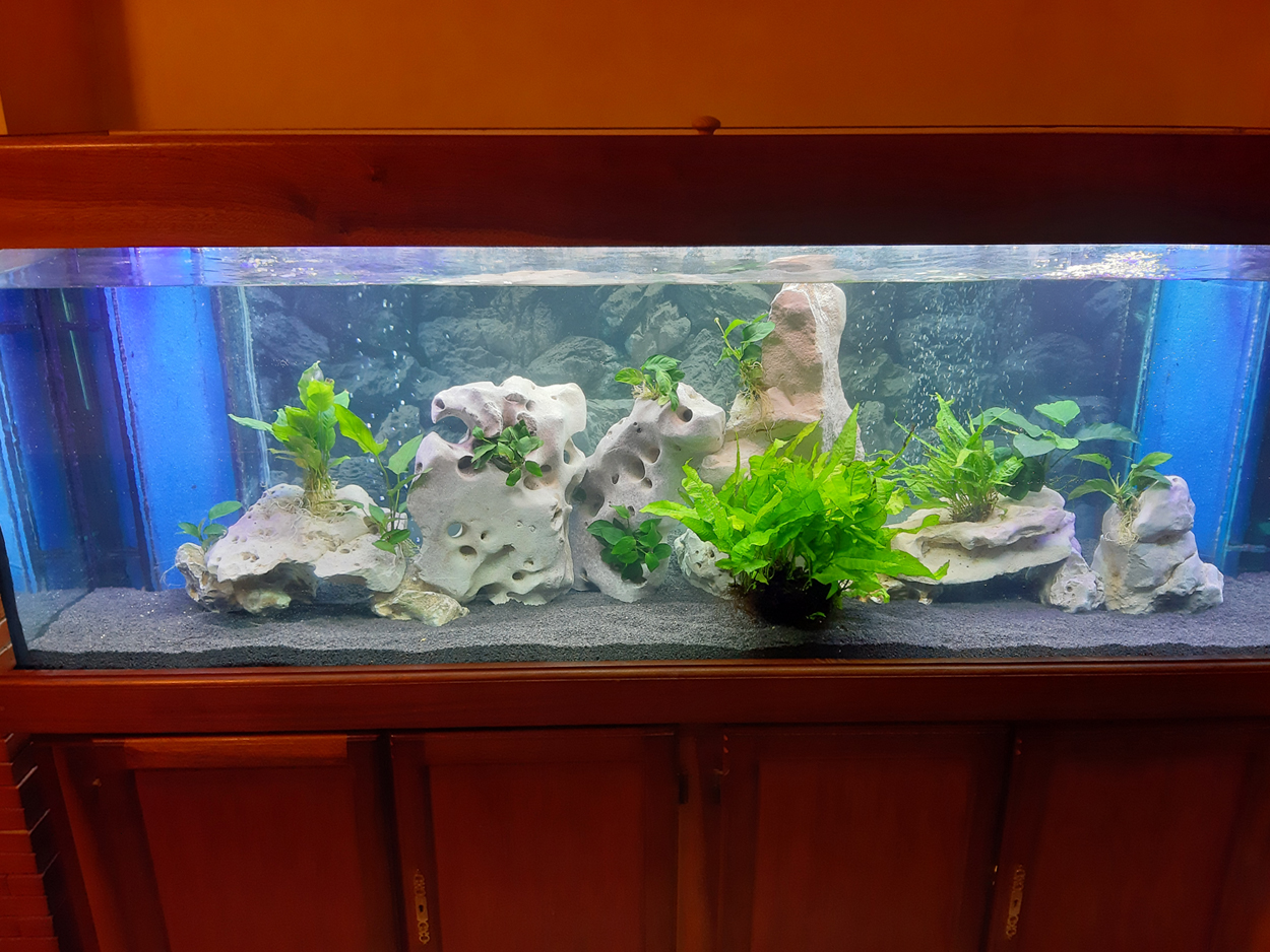 A mon avis, mais tu fais bien comme tu le sens, tu devrais réunir tes pierres sur un coté, et faire un tas de l'autre coté également, en équilibre pour faire des cachettes etc, mais pas les aligner comme ça. Effectivement là ca donne l'impression qu'il y en a pas mal, mais peu de cachettes. Pour l'instant tu n'as pas ta population, tu peux faire des essaies sur le sol en mettant tes pierres dans différents sens etc... Mais tu verras qu'il te faudra surement plus de roches, t'as 650L et c'est pas peu  .
