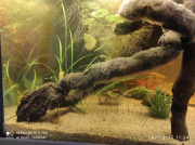 Nous avons donc aujourd hui 7 cory julii, 6 sterbaii et 16 cardinalis ( paracheirodonaxelrodi mamilum ) Et là bam comme une flèche qui transperce le cœur, je suis tombé amoureux des corydoras. Au niveau des paramètres je suis pas encore top kh 4, gh 5 ph 7.2. et No2 en jaune très clair donc proche de zéro il me semble ( pas encore acheté les autres tests ) . Comme mon ph etait un peu haut ( 8.5) j ai fais rapidement des changements d eau à l eau de pluie et à l eau osmosé ce qui m a permis de baisser kh et gh de trois points environ. j ai aussi ajouté un pochon de feuille de chêne sèches ( l eau ambré j aime bien) ainsi qu une autre racine que j ai bien fais bouillir avant ( racine qui a fais un magnifique voile blanc dont se sont régalés les cory )
