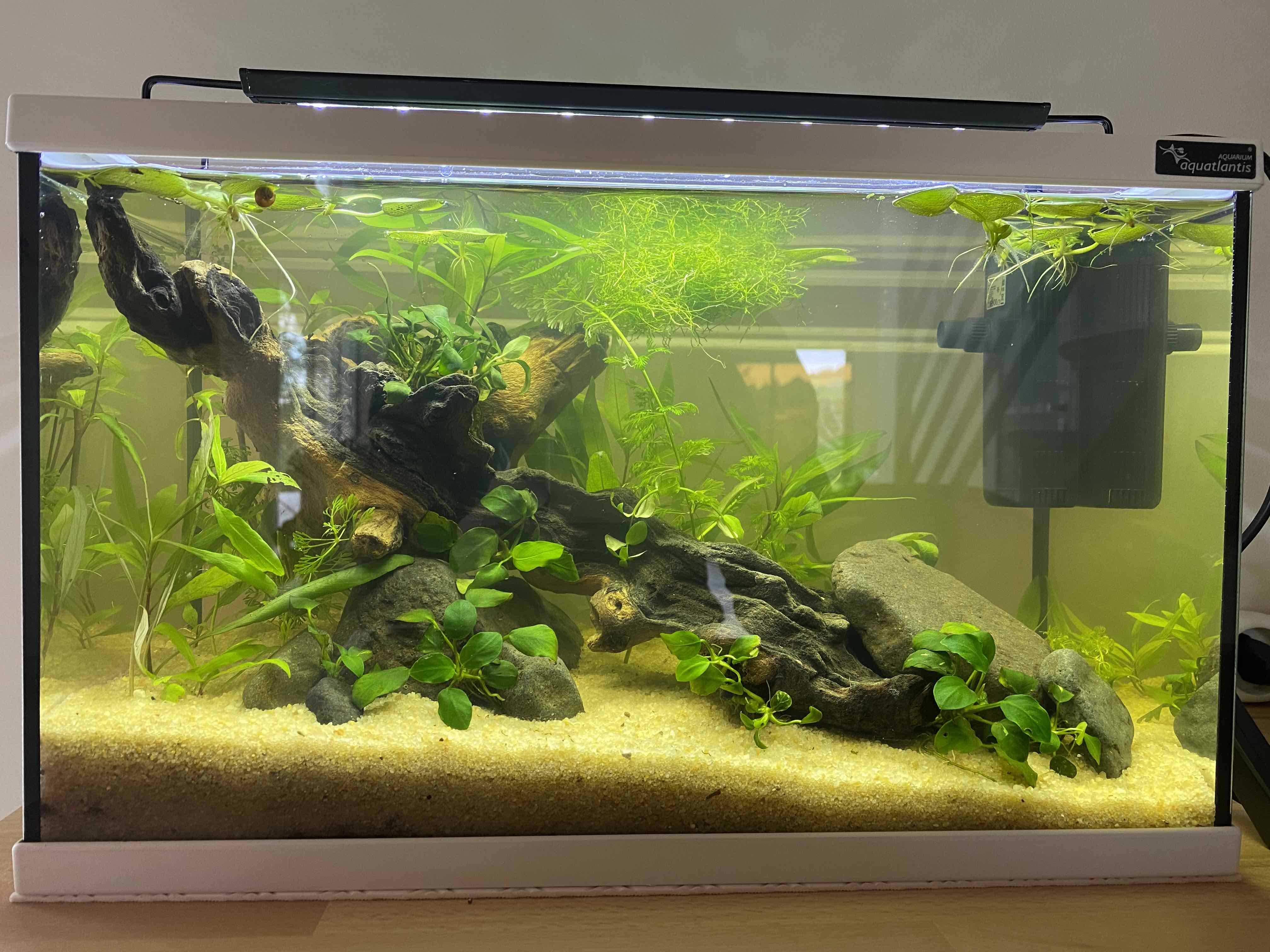 Pour les algues brunes, ce sont sans doute (je ne les vois pas  ) des diatomées, qui partiront d'elles-mêmes. Tu peux nettoyer la vitre avant sans préjudice pour la micro-faune. Pour les crevettes, la première cause de mortalité reste l'acclimatation. As-tu vérifié la conductivité de l'eau des deux contenants et ajusté l'acclimatation en fonction du delta ? La deuxième cause "courante" de mortalité est l'excès de nitrites ou d'ammoniaque. Ces paramètres devront être surveillés sur ce bac qui reste très petit, donc sujet au déséquilibre.