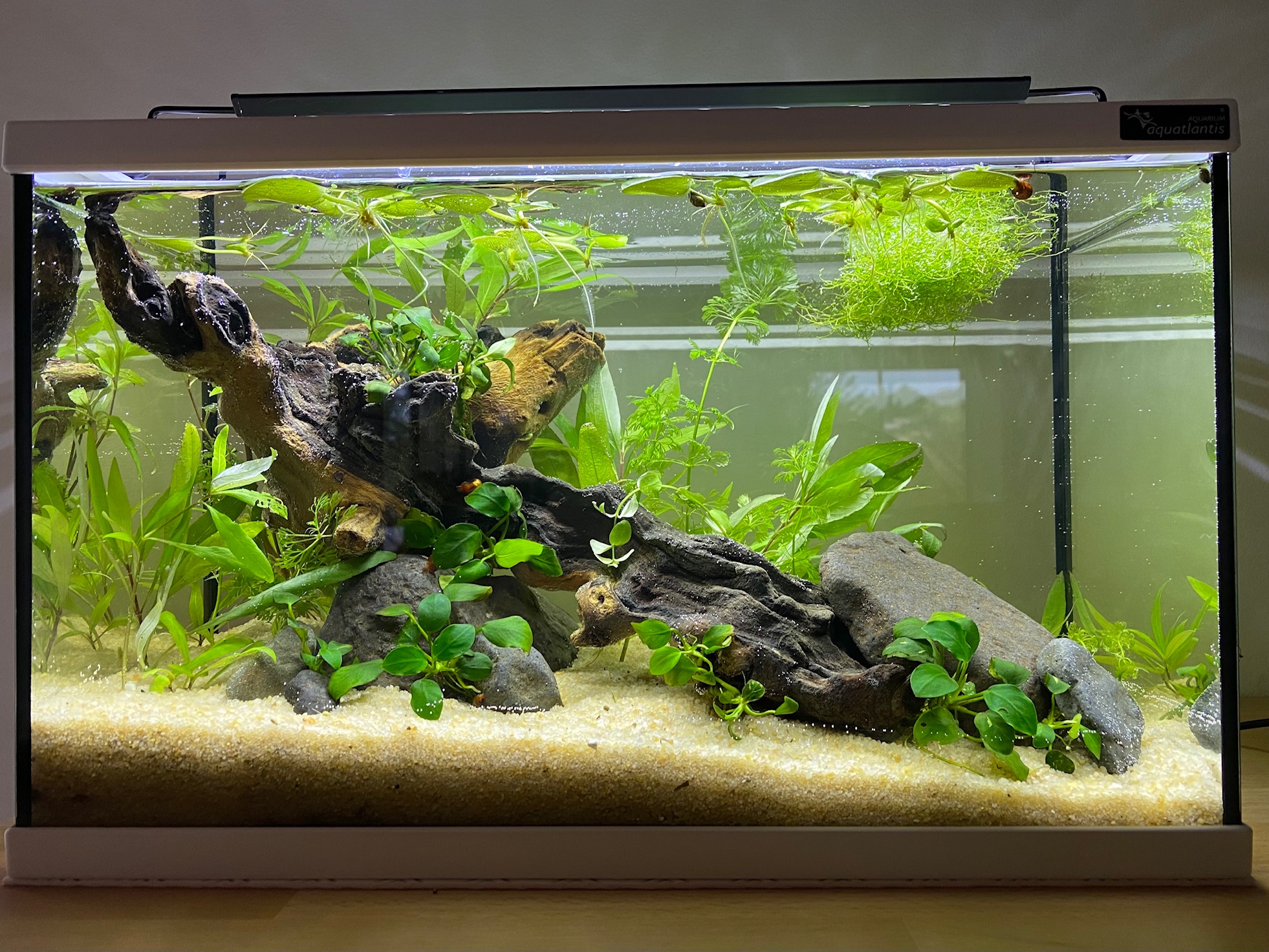 Pour le décor j’ai utilisé le basalte auvergnat, piqué une racine à mon mari (qui est plutôt terrario) et trouvé des plantes chez une jeune qui voulait vider son aquarium : anubias nana, limnophila sessiliflora, hygrophila polysperma (je pense), une à feuille plutôt rondes non identifiée (en plein milieu). Et récupéré quelques flottantes de mon 50L : grenouillettes et riccia.