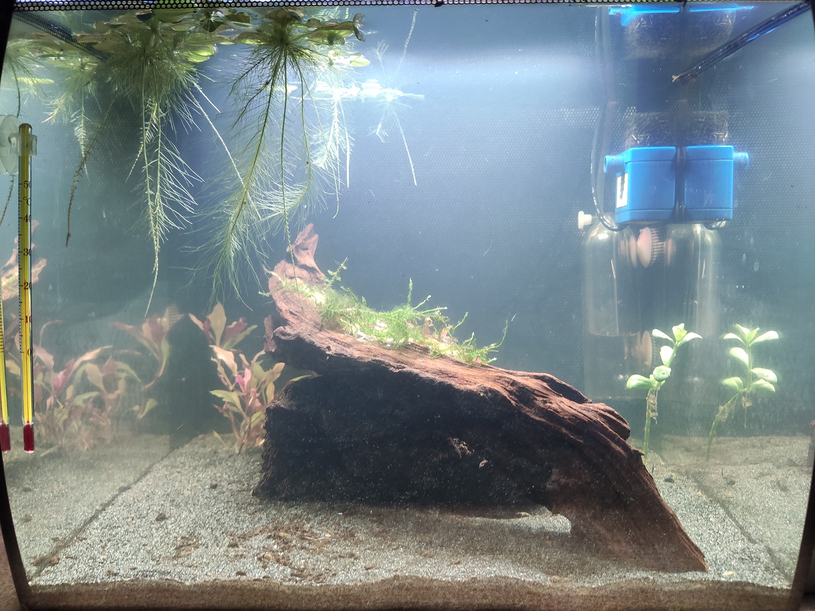 Bonjour à tous, il trainais, j'ai pas résisté, j'ai donc lancé un bac de 40L brut un peu à l'arrache, je le destine à de la crecre blue velvet et potentiellement à du grossissement de repro de cory, si j'arrive à en avoir cette hiver, je vais tenté le coup, mais j'ai peur que dans le 180L, les aphycharax ne fassent qu'une bouché des alevins. Pour le moment, j'ai juste une racine, une pierre, du terreau au fond (la vitre du fond) du bac, sous un sol doux et neutre (Sansibar black). En plante, j'ai: - Pistia - Quelques Lemna (elles se glissent sous les feuilles des pistias) - Althernantera Cardinalis (j'ai craqué je sais  ) - Bacopa monnieri (je crois, je compte pas la laisser là, ou peut être, à voir) - Christmas moss sur la racine