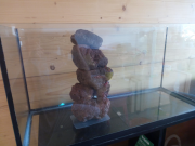 Ça y est, j'ai fait mon pilier en lave! Ne vous marrez pas, il m'a fallu 2h pour trouver le bon ampilement et le coller au silicone (c'est moins bancale). Je l'ai posé sur une plaque de plastique pour éviter le contact direct avec le verre du bac. Même ma femme qui s'en fou à trouvé ça chouette