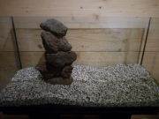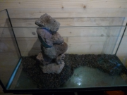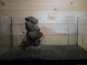Une tour de pierres volcanique (genre nuraghe ?) dans un quatre-vingt litres ? Elle risque de manger toute la place et de gêner le nettoyage ! Et je te conseille d'éviter le centrage de l'édifice... trop peu naturel. Bon, sinon tu peux coller les pierres ensemble, il existe des colles faites pour ça. La coller au fond du bac ne devrait pas être nécessaire si ce n'est pas de la pierre ponce.
