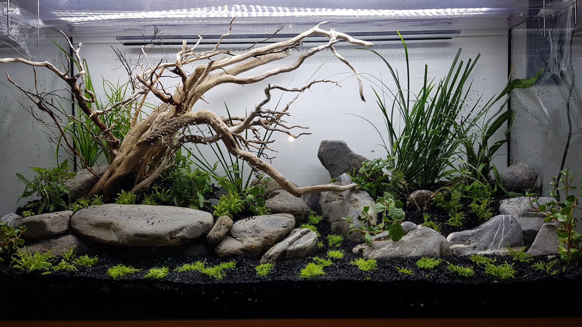Juste une rectification à faire. La pogostemon helferi n'est pas une gazonnante mais une plante d'avant plan : elle ne va pas tapisser le sol. Pourquoi ne veux tu pas mettre de gouramis, comme le gourami perlé, le gourami nain, le gourami miel ou encore le gourami grogneur nain ? Mais sinon c'est vrai que ton bac est très beau.