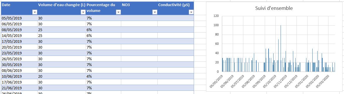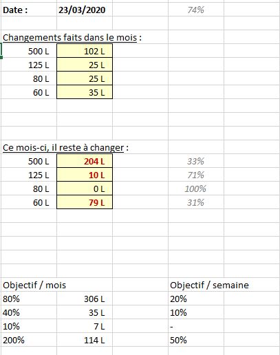 Un petit outil Excel maison me permet de suivre où j'en suis sur mes changements d'eau du mois.