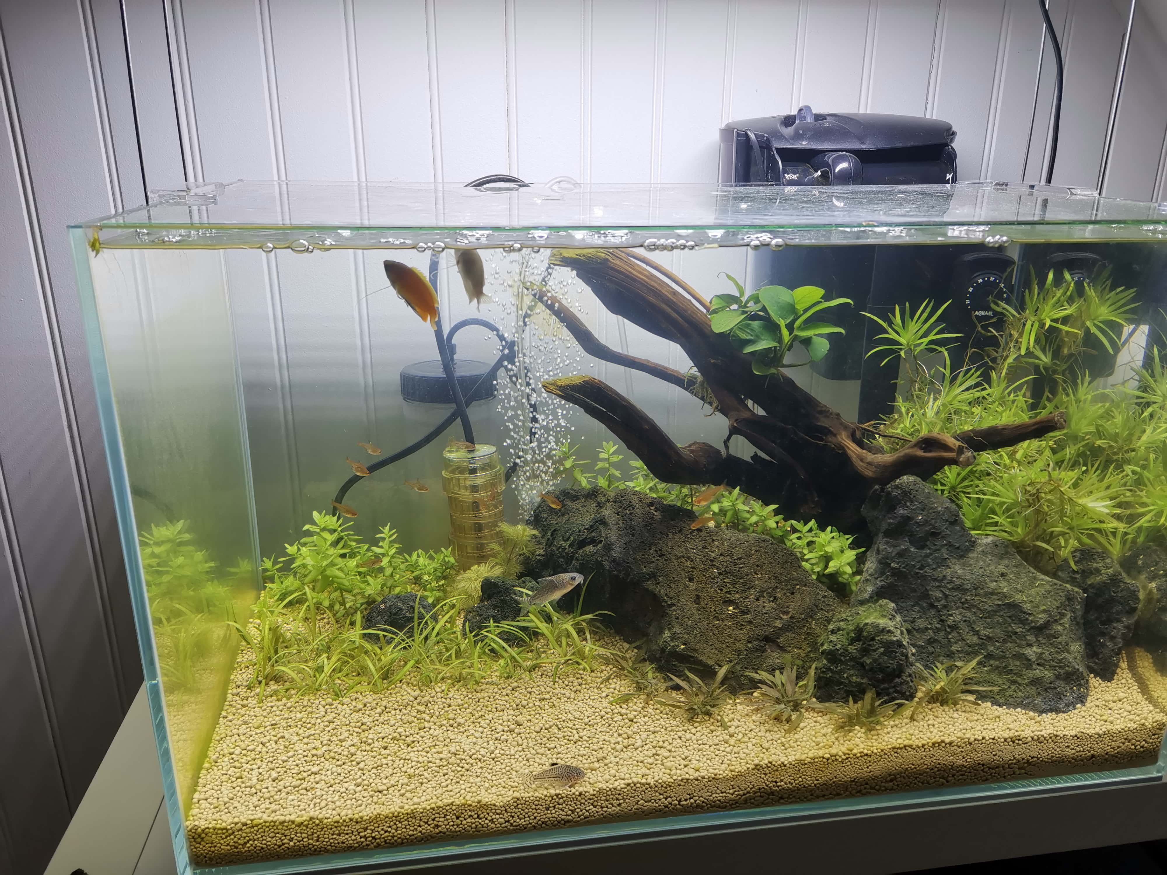 Bonjour ChamballuLuca, Tu devrais ajouter des plantes de surface pour tes Colisas. Les roches volcaniques sont abrasives est risque fort de blesser tes poissons. Peux-tu nous donner les paramètres de ton eau, GH, KH, pH, NO2 et NO3 ?