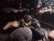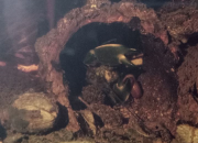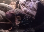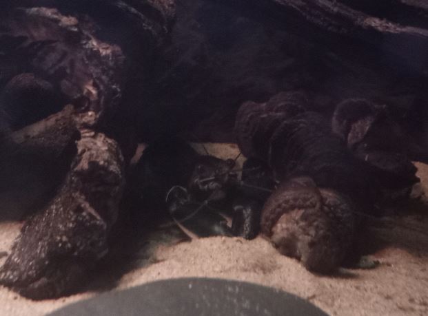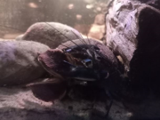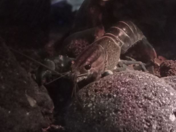 Zhaïtan sort toujours dés que je me présente devant la vitre, mais c'est maintenant clairement pour réclamer à manger. Il attrape la nourriture calmement et précisément. Si ce que je donne ne lui plait pas plus que ça il le met dans son terrier, et revient aussitôt réclamer autre chose. Il adore le poivron jaune poché. Soo-WonFin juillet une grosse frayeur. Si les mues des crevettes sont blanches et translucides, les mues des écrevisses ressemblent clairement à une écrevisse entière... morte.  Je n'ai réalisé qu'elle allait bien que quand j'ai vu 4 paires de pinces qui dépassaient toujours des terriers. Euh... Je n'ai pas 3 écrevisses ? La mue de Soo-Won.  Elles peuvent grossir de 15 à 40% de leur taille en une fois et Soo-Won est clairement plus grosse qu'avant et elle ne rentre plus dans sa cosse préférée.  Soo-Won qui a grossi.   Après la mue elle s'est cachée durant 3 jours et a ensuite repris son activité normale. J'aimerai bien que Zhaïtan mue également car sa carapace montre quelques signes d'érosion et de la saleté, et seule la mue peut résoudre cela. Et comme il est encore en croissance, cela fait une longue période sans muer depuis son arrivée. Mais ça a pris du temps à Soo-Won également. Elle n'a pas trop pu profiter de l'exosquelette qu'elle aurait dû manger, car Zhaïtan l'a mangé à sa place tandis qu'elle se planquait... Pour finir, leurs interactions en ce moment sont plus calmes. Il y a eu tentative de reproduction - calme. Et je les trouve parfois en train de manger des feuilles côte à côte en dehors des terriers. Les japonicas s'aventurent dans les terriers pour manger la nourriture et les écrevisses les ignorent. Zhaïtan leur est parti après une fois, mais il n'a pas la rapidité nécessaire et a vite laissé tomber.